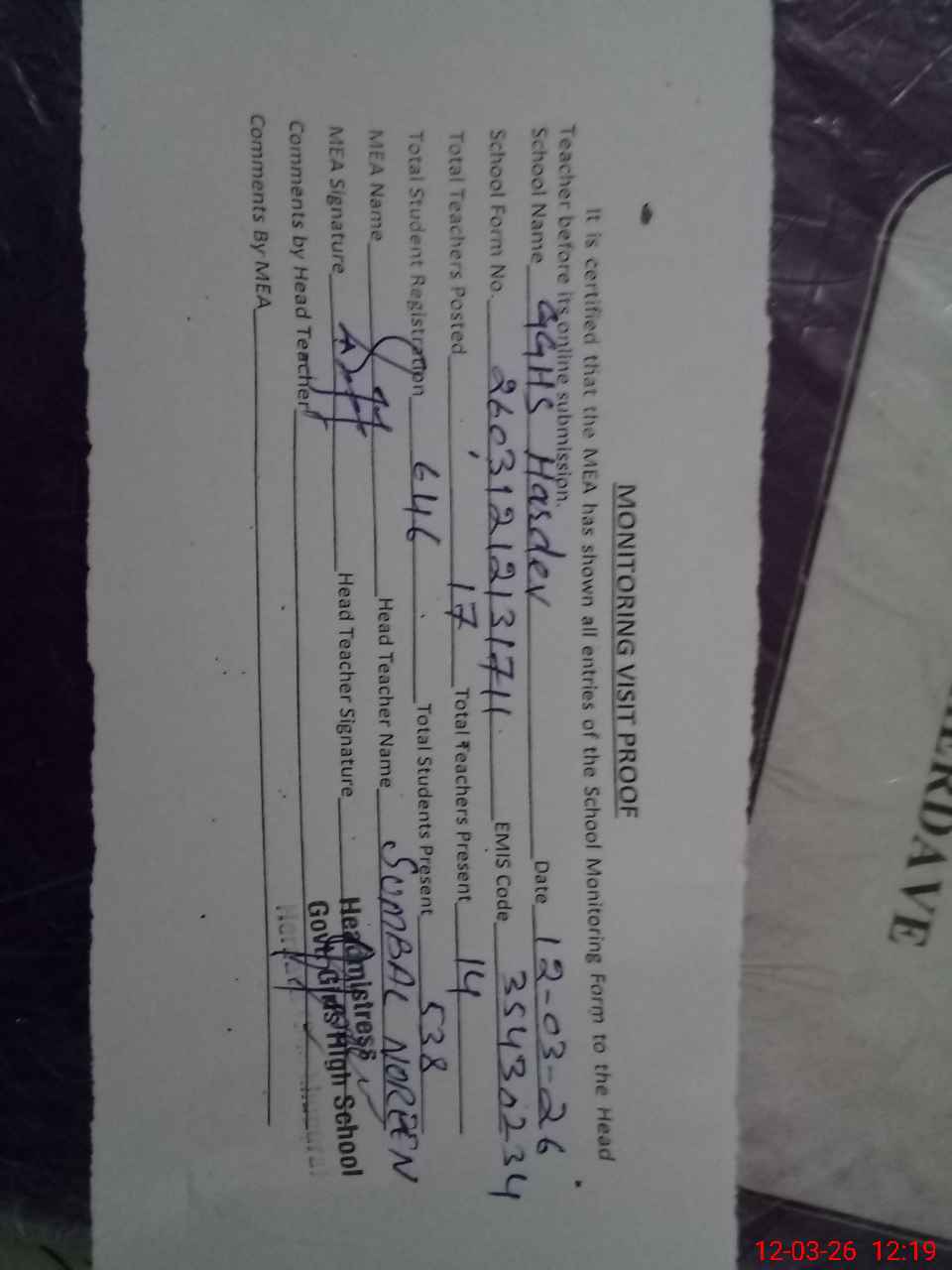 | Attendance Register | Head Teacher | MEA with School | Visit Proof |