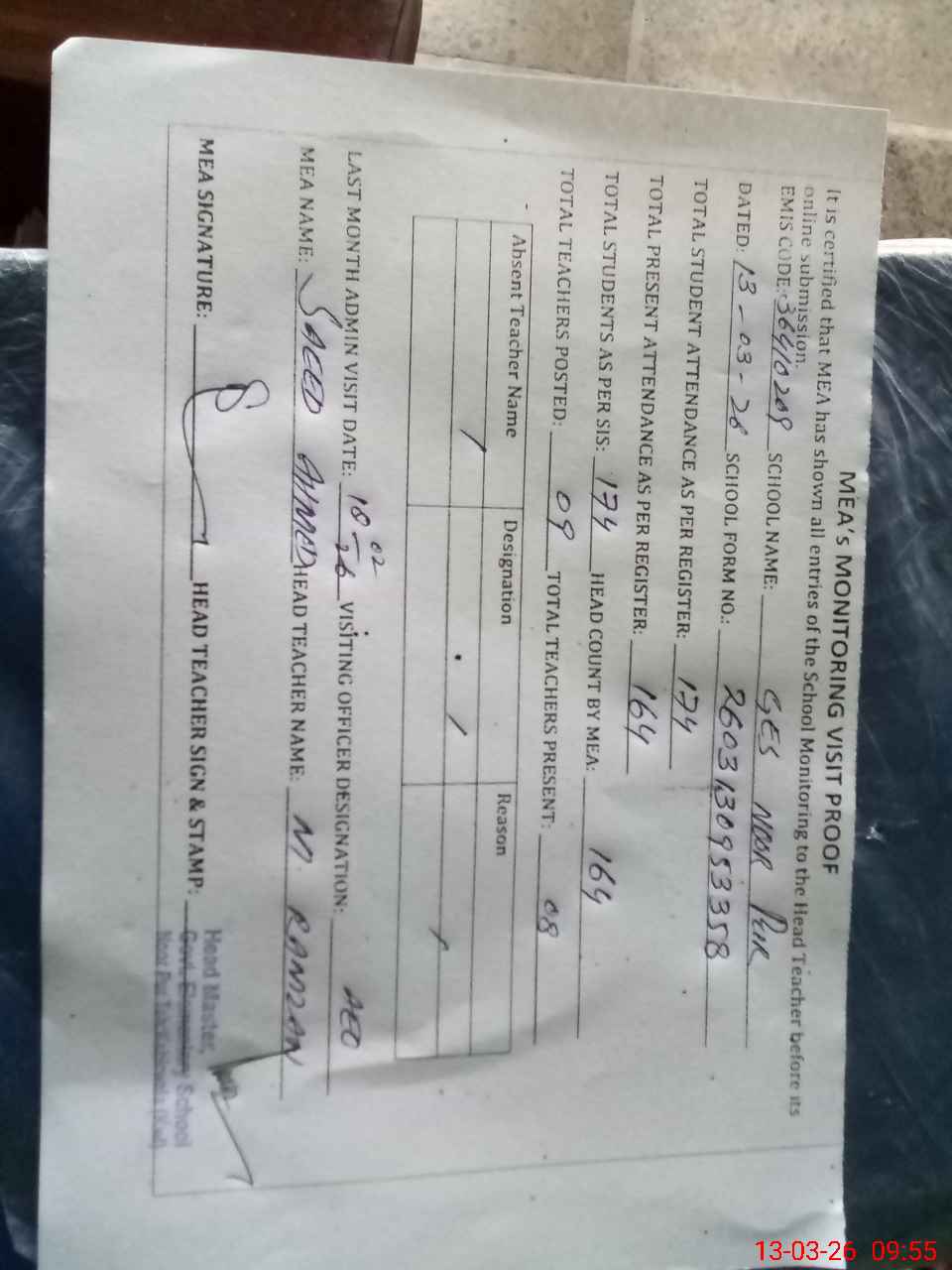 | Attendance Register | Head Teacher | MEA with School | Visit Proof |