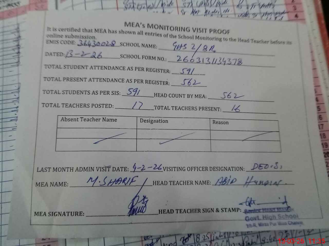 | Attendance Register | Head Teacher | MEA with School | Visit Proof |