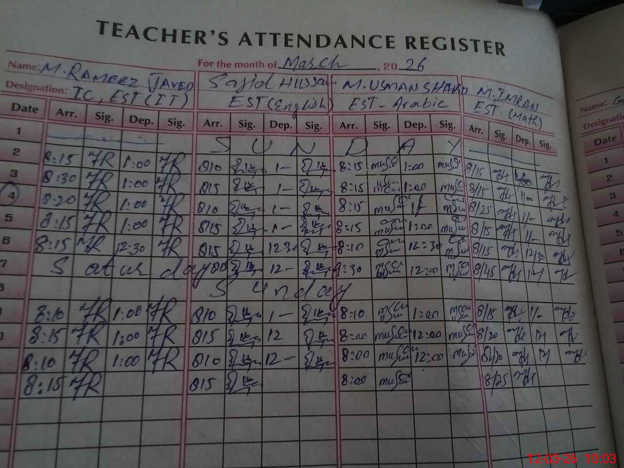 | 36**** | Mu**** Iq**** | PST Arts | Regular | 0 | 0 | 0 | 0 | 0 | 0 | 0 | 0 | 0 | Exam Duty |