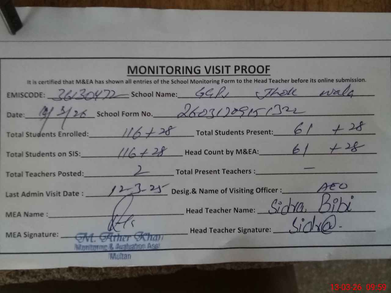 | Attendance Register | Head Teacher | MEA with School | Visit Proof |