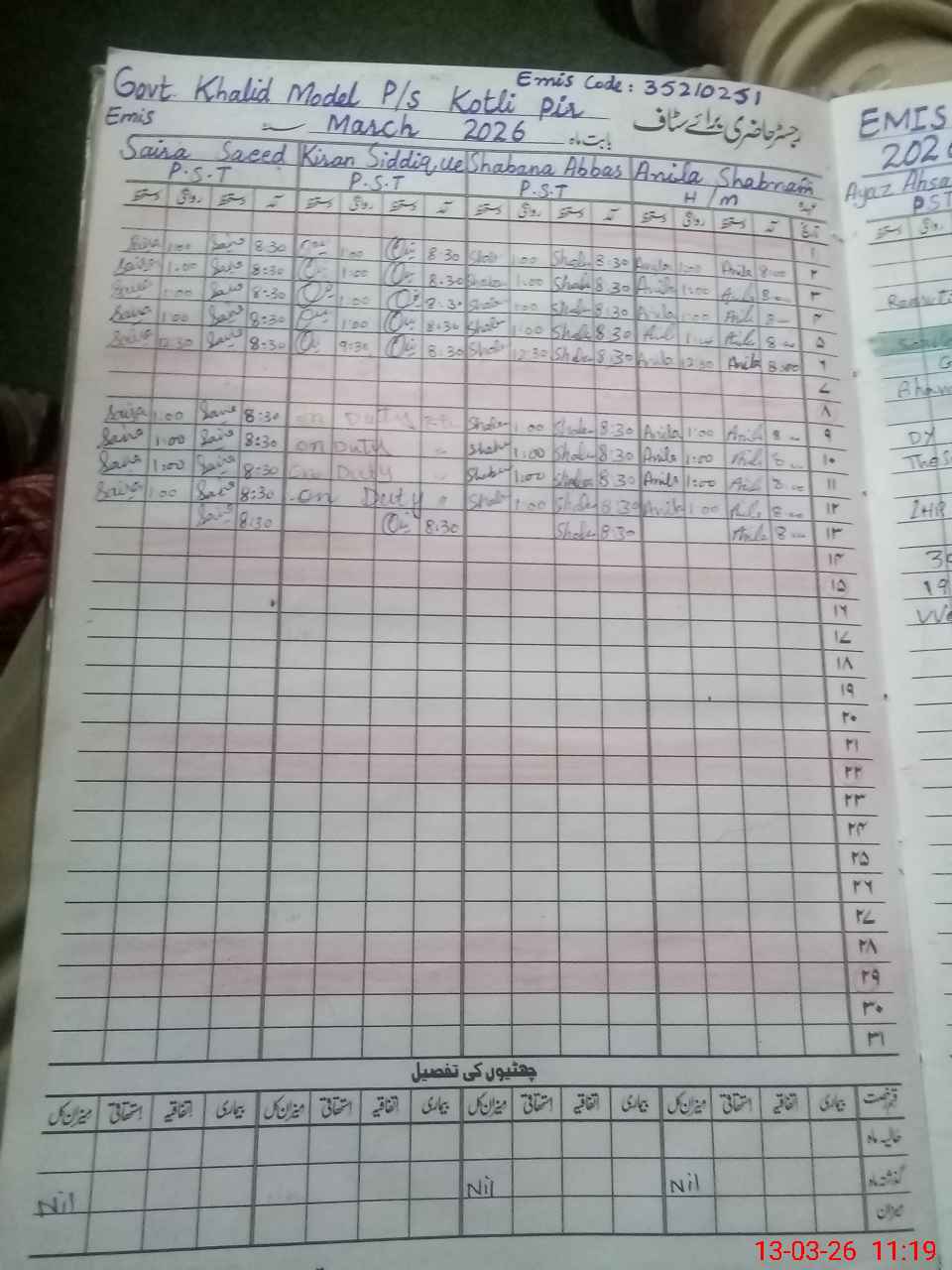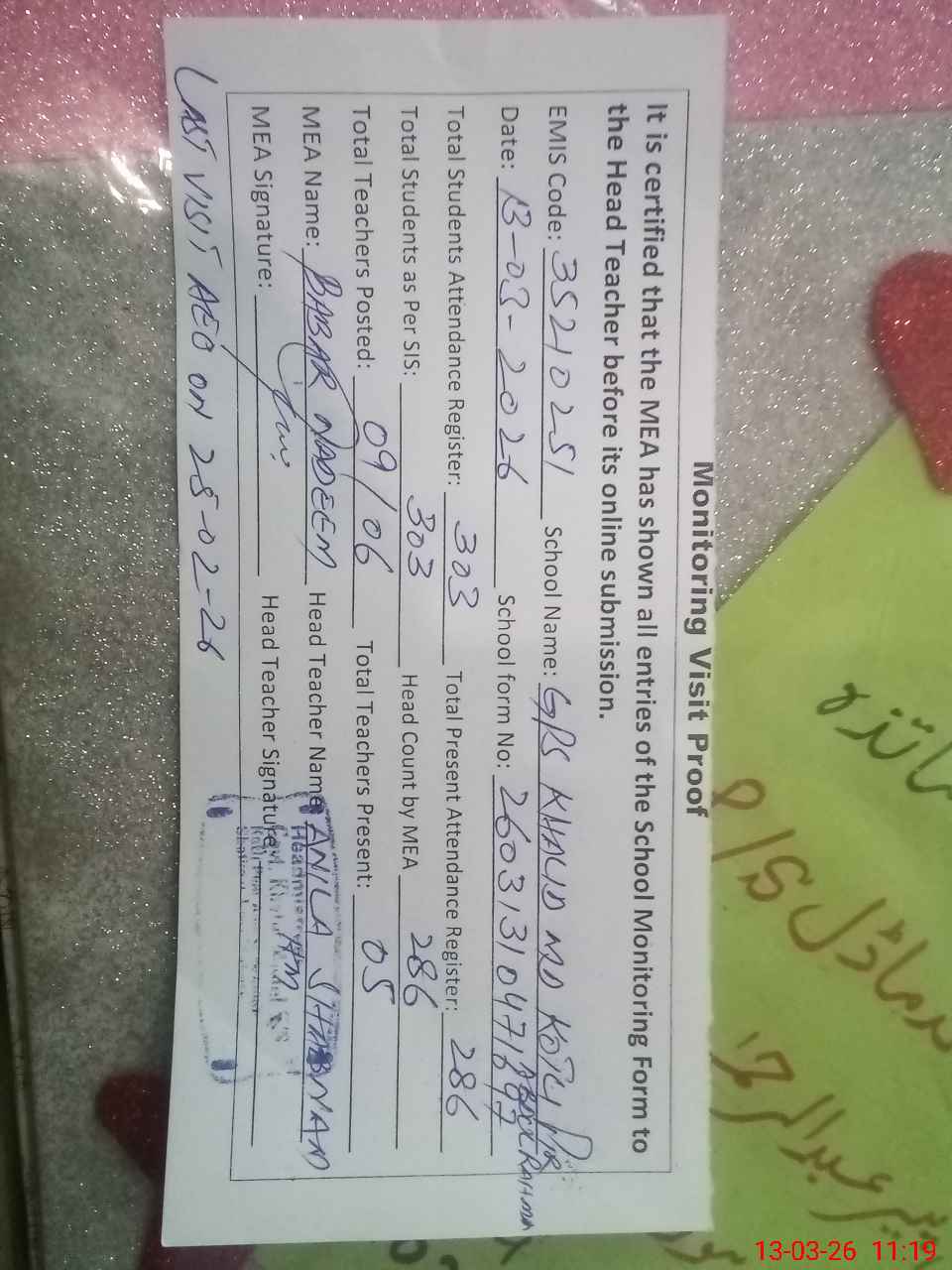 | Remarks (Use Separate Page if Required): 1 Ghulam Murtaza Sweeper not present in school so according to SOPs marked him absent 2 NSB and FTF record registers not updated accordingly 3 One washroom is under construction since 26 November 2025 | |||||