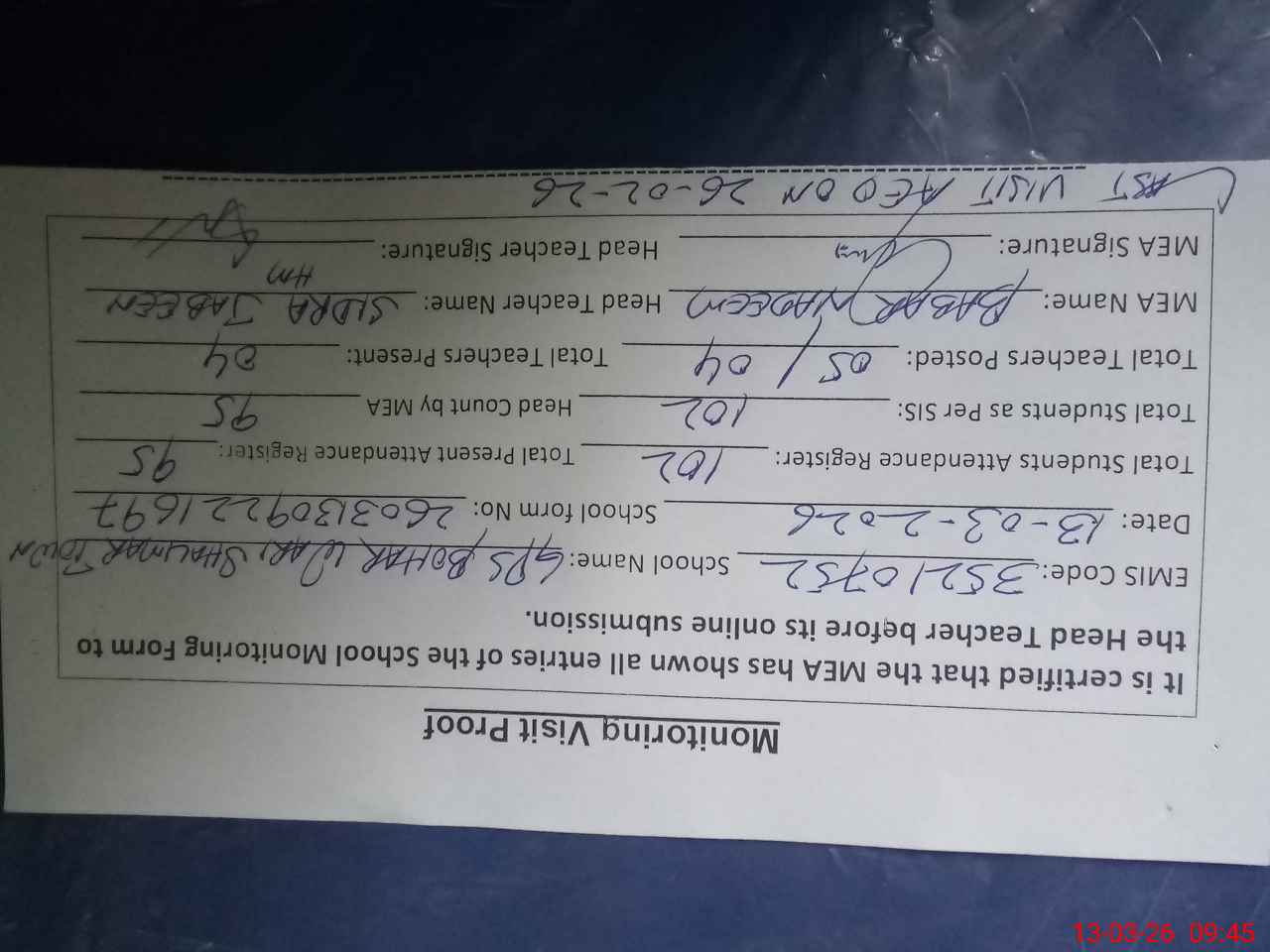 | Attendance Register | Head Teacher | MEA with School | Visit Proof |