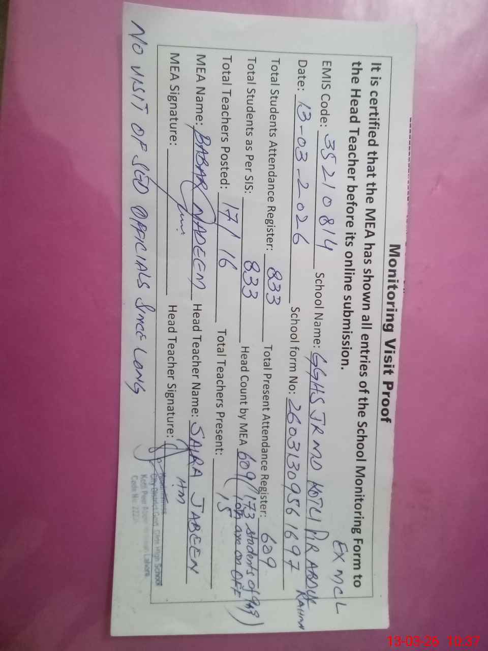| Attendance Register | Head Teacher | MEA with School | Visit Proof |