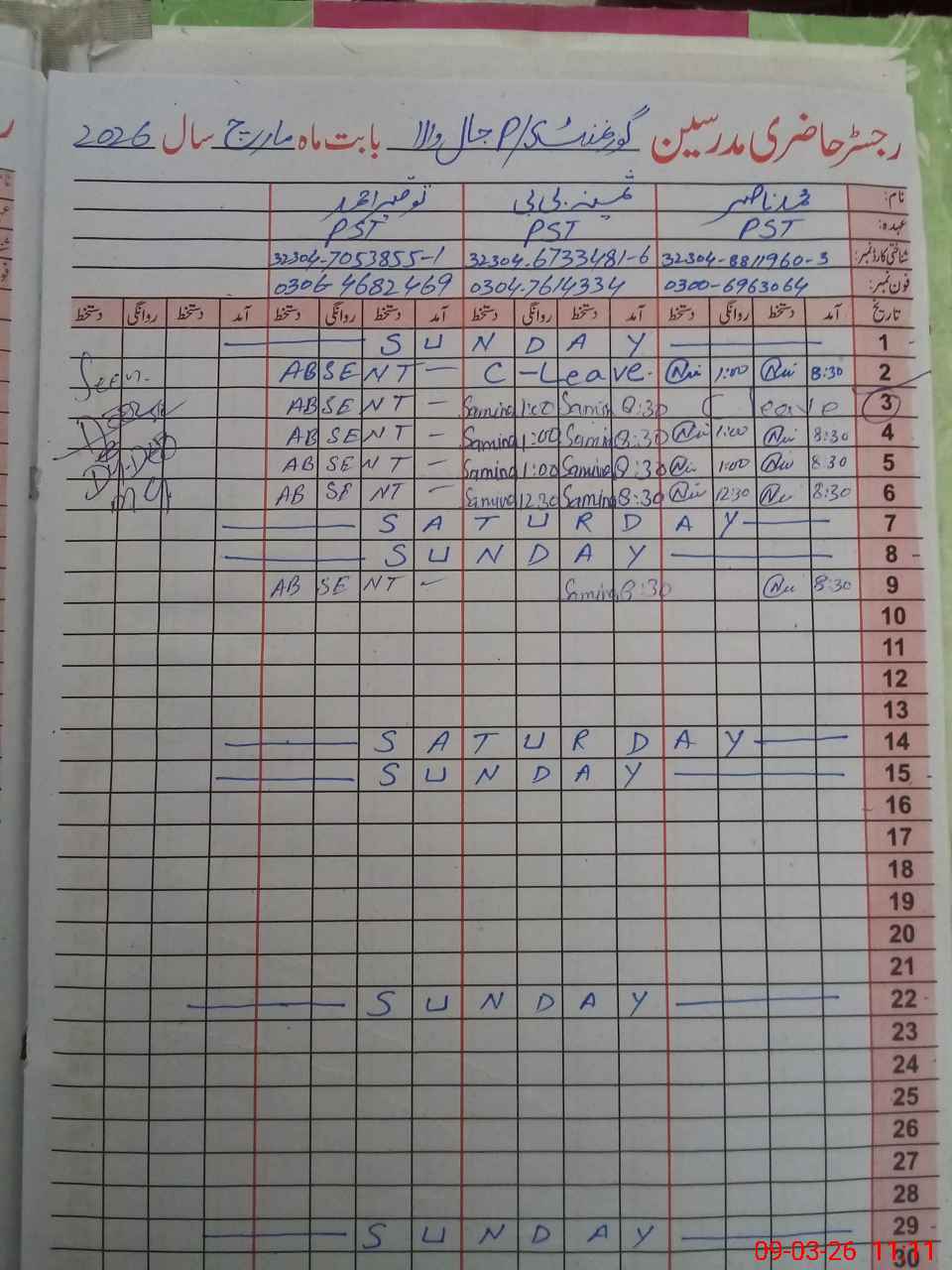 | Name: WA**** SH**** Designation: (School Headmaster's/Headmistress's) PST Phone/Cell Number: 03**** |