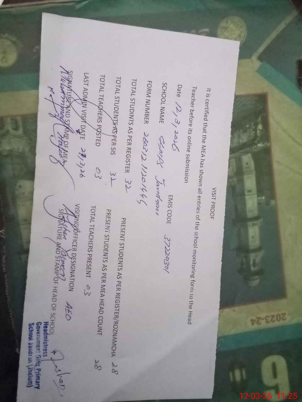 | Attendance Register | Head Teacher | MEA with School | Visit Proof |
