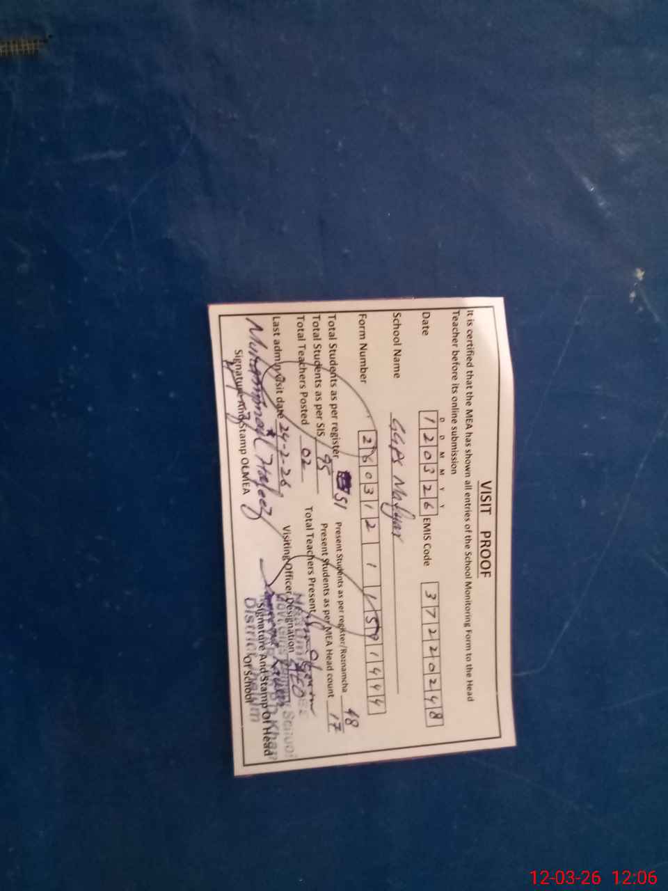 | Certified that this School was Inspected by the Undersigned MEA/DMO Today and the Information Stated Above is as Per Record. | |||||