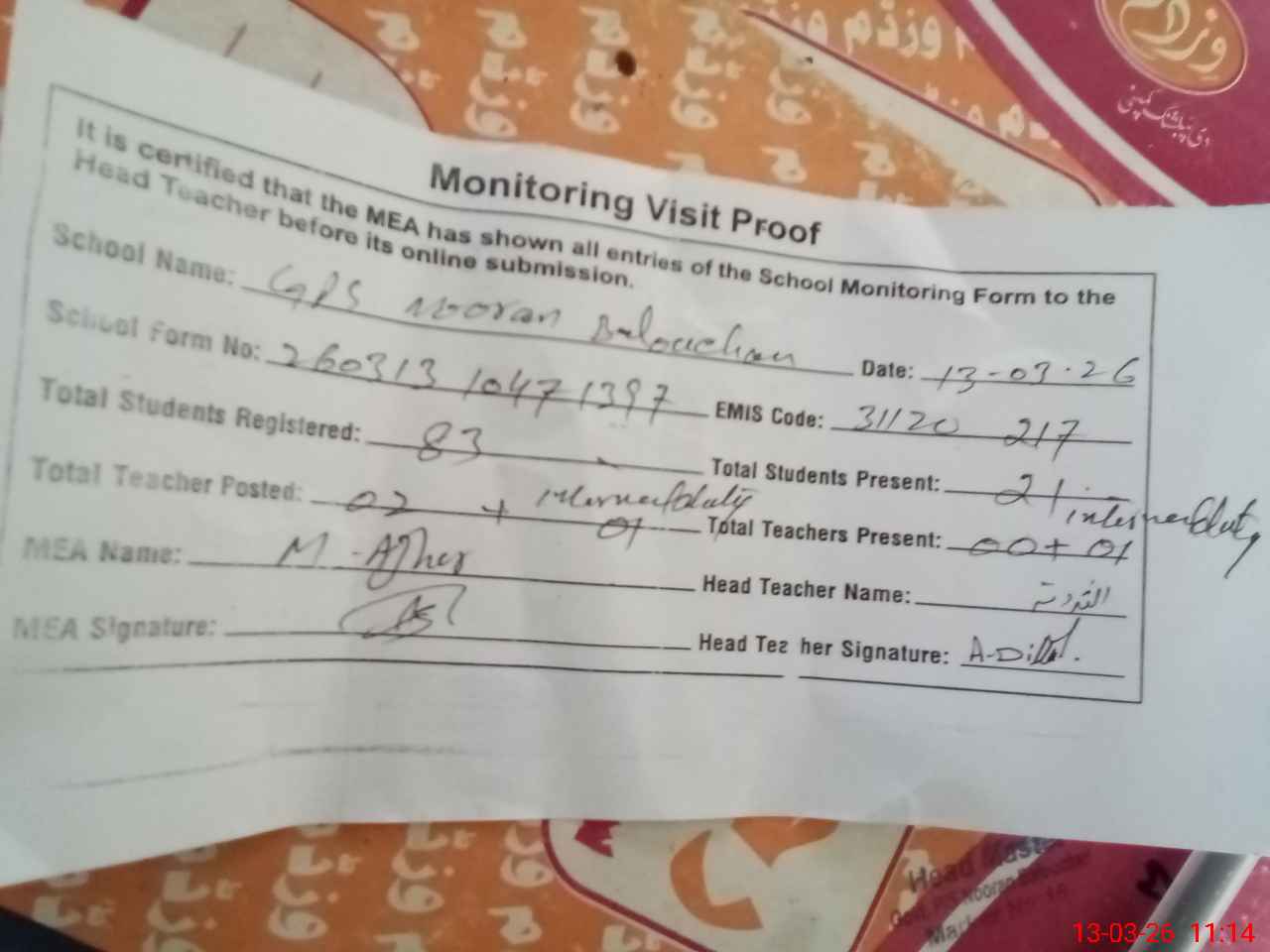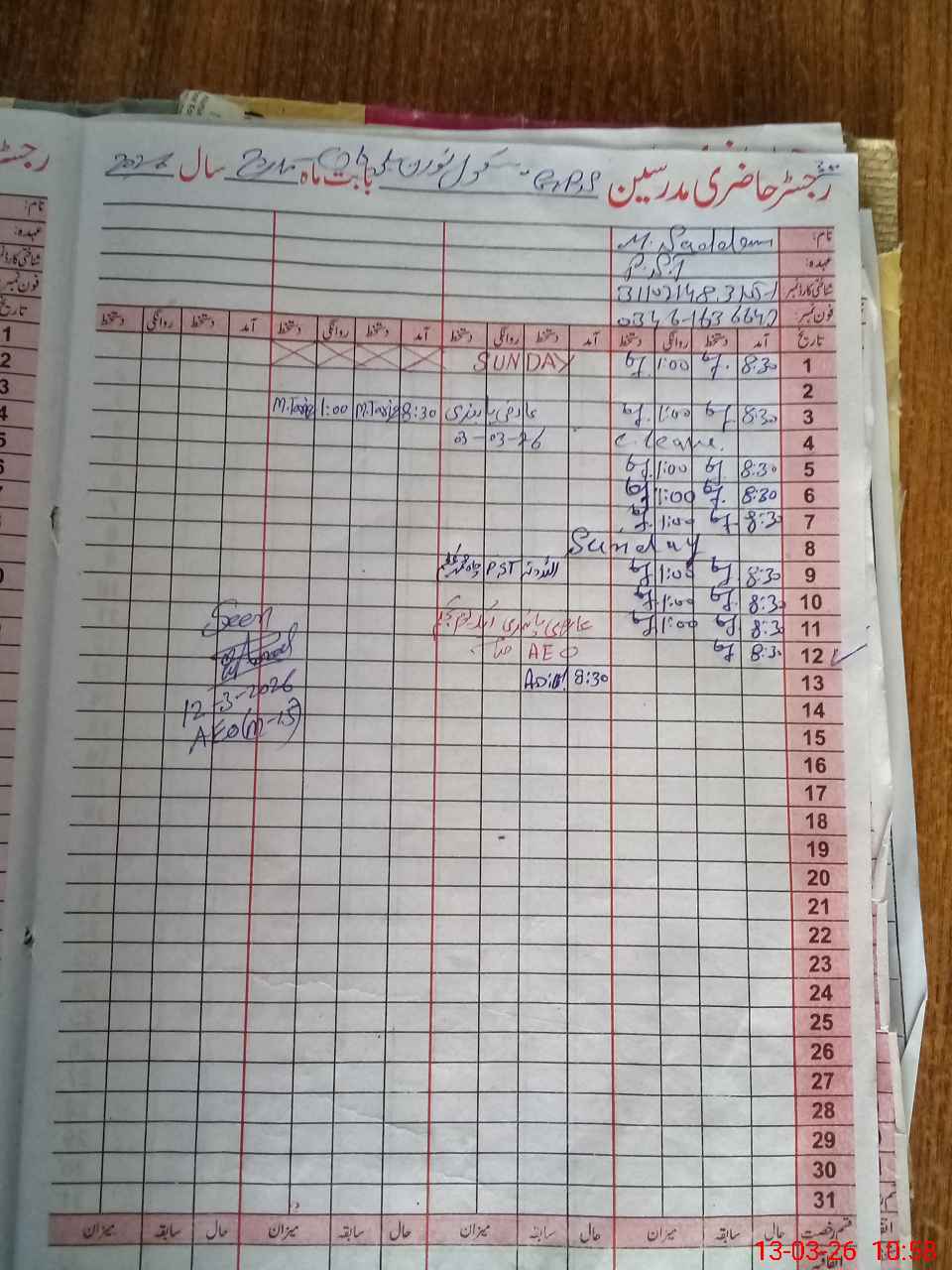 | Remarks (Use Separate Page if Required): NSB record register not shown to mea and students attendance register are not updated and and Free text books record not shown to mea and TEACHER. Allah Ditta is on internal duty and he is present and he told that I did not know about permanent posted teachers of this school and students attendance register are not updated and names of students on ATTENDANCE REGISTER for the month of March 2026 are not written and also no attendance for whole month of march and students of class Nursery and ECCE NOT PRESENT in the school | |||||