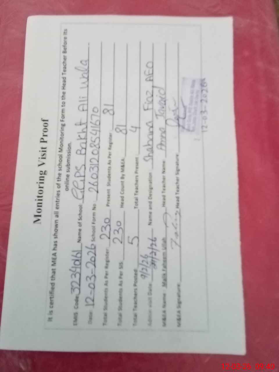 | Attendance Register | Head Teacher | MEA with School | Visit Proof |