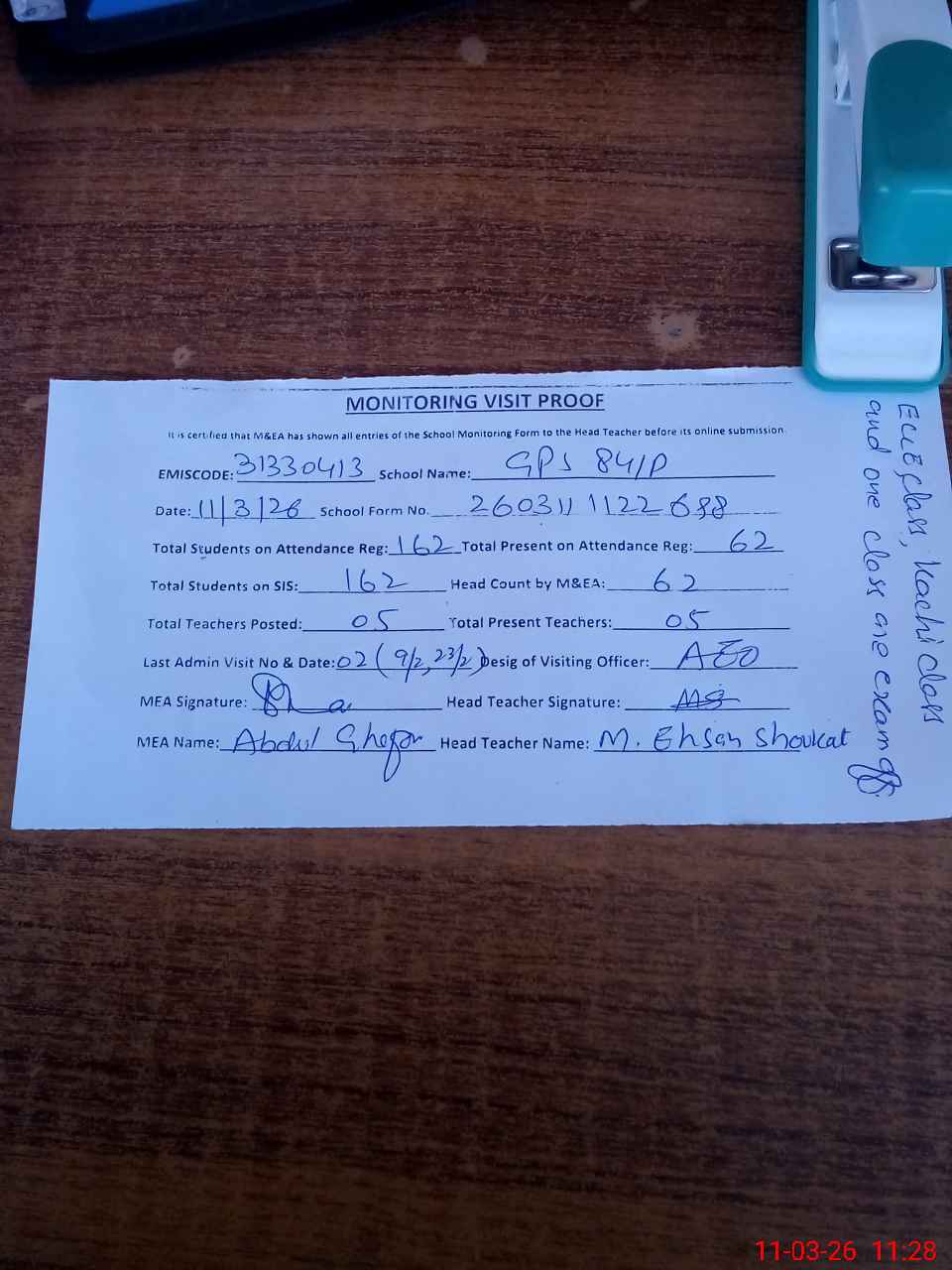 | Attendance Register | Head Teacher | MEA with School | Visit Proof |