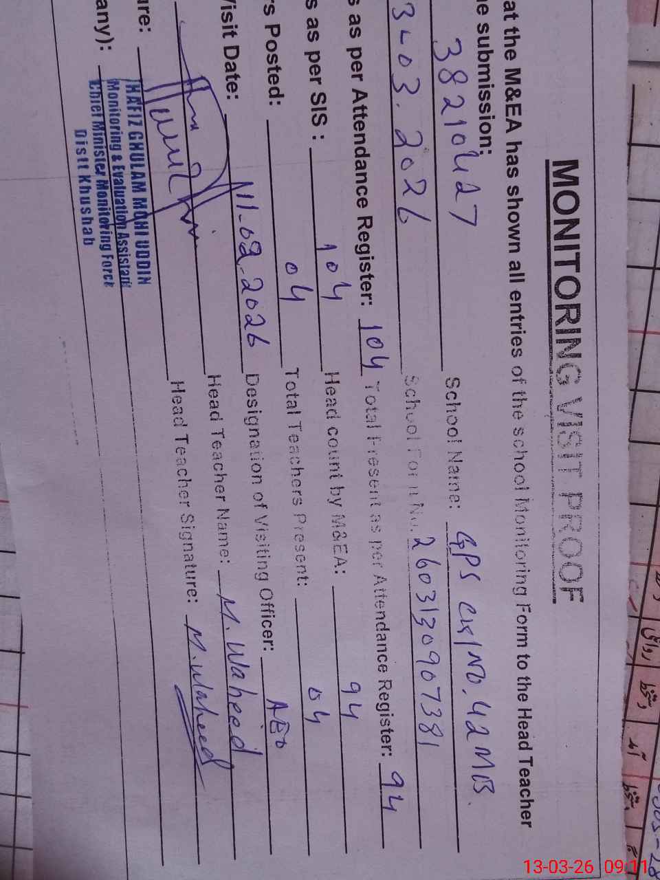 | EMIS Code: 38210427 | Name of School: GPS CHAK NO. 42 MB | |||