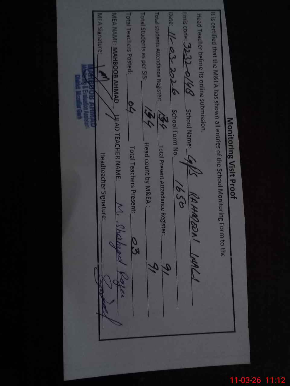 | Attendance Register | Head Teacher | MEA with School | Visit Proof |
