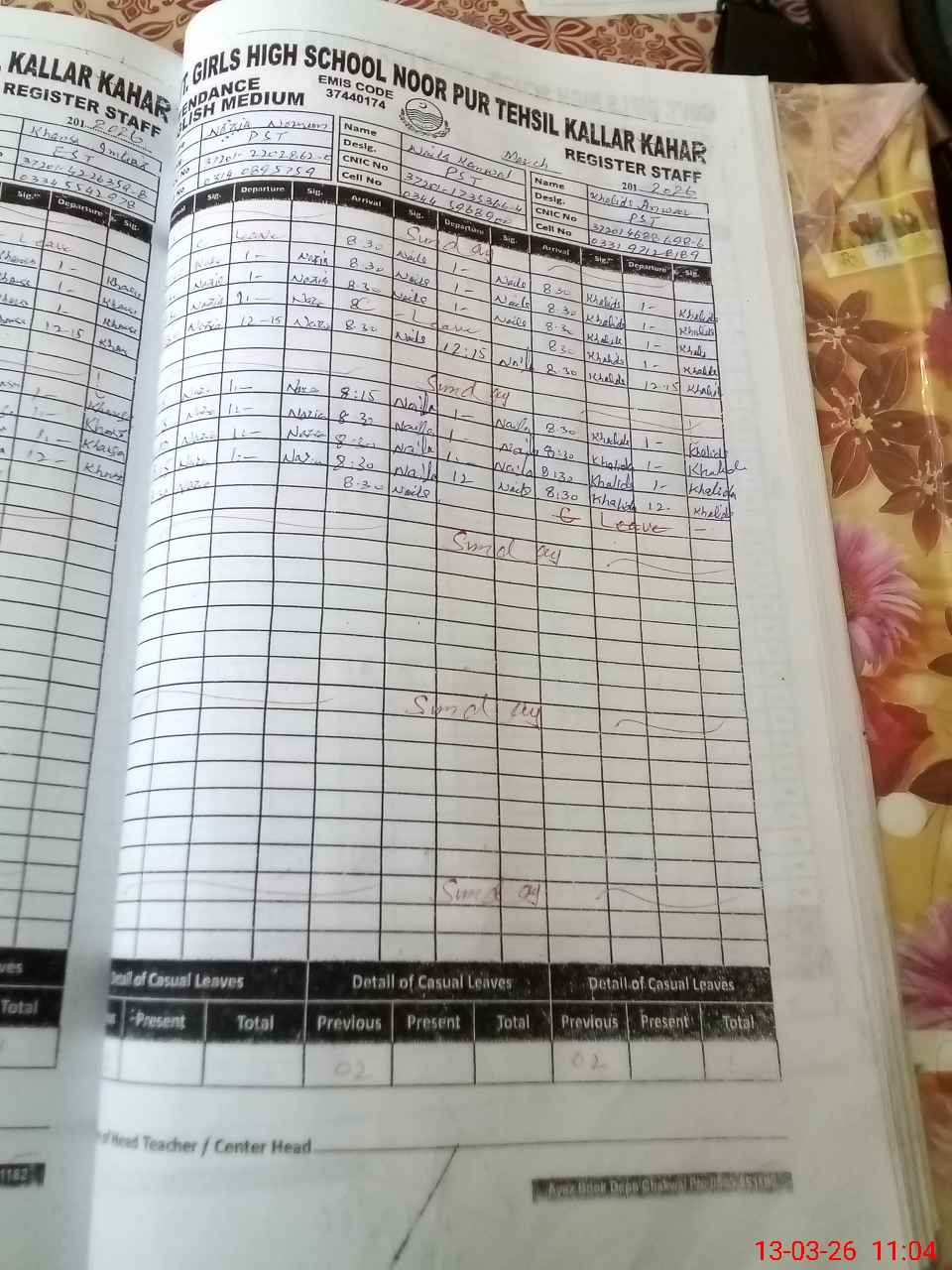 | CNIC | Full Name | Designation | R/C | Absence During Last Calender Month |