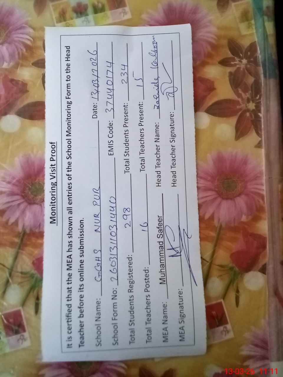 | Attendance Register | Head Teacher | MEA with School | Visit Proof |