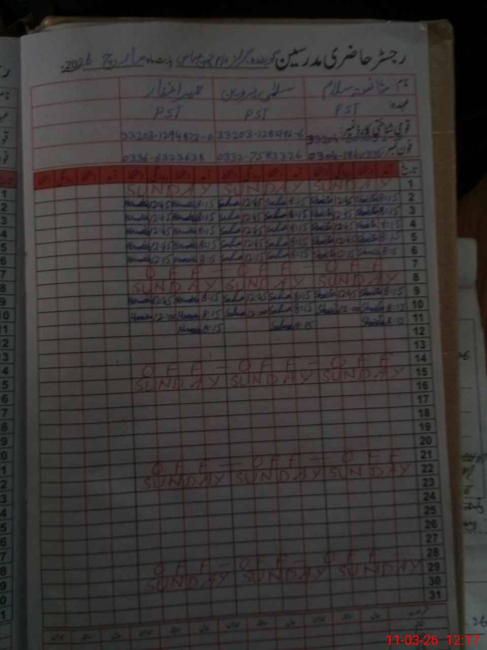 | CNIC | Full Name | Designation | R/C | Absence During Last Calender Month |