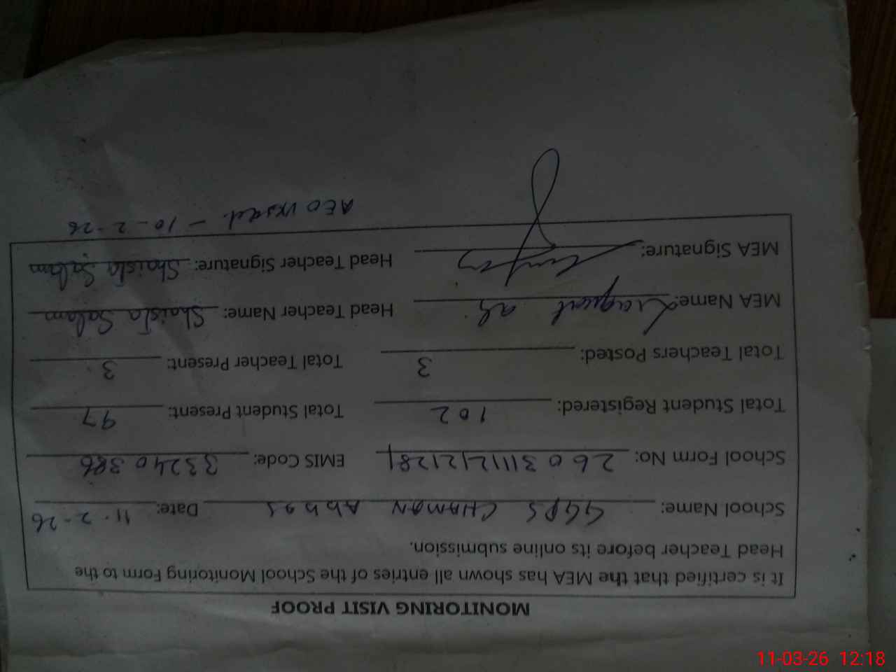 | Attendance Register | Head Teacher | MEA with School | Visit Proof |