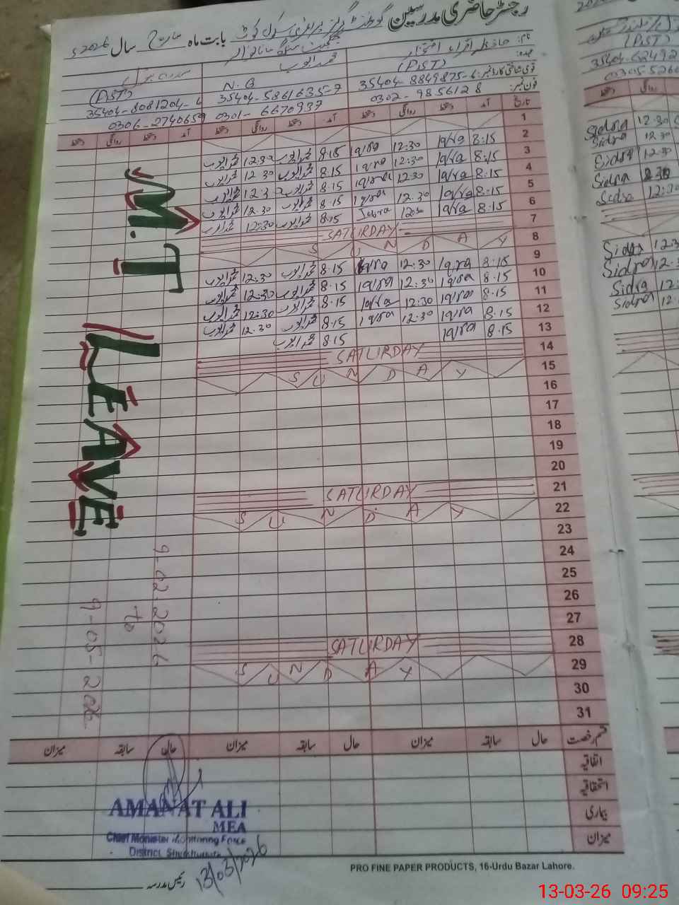 | CNIC | Full Name | Designation | R/C | Absence During Last Calender Month |