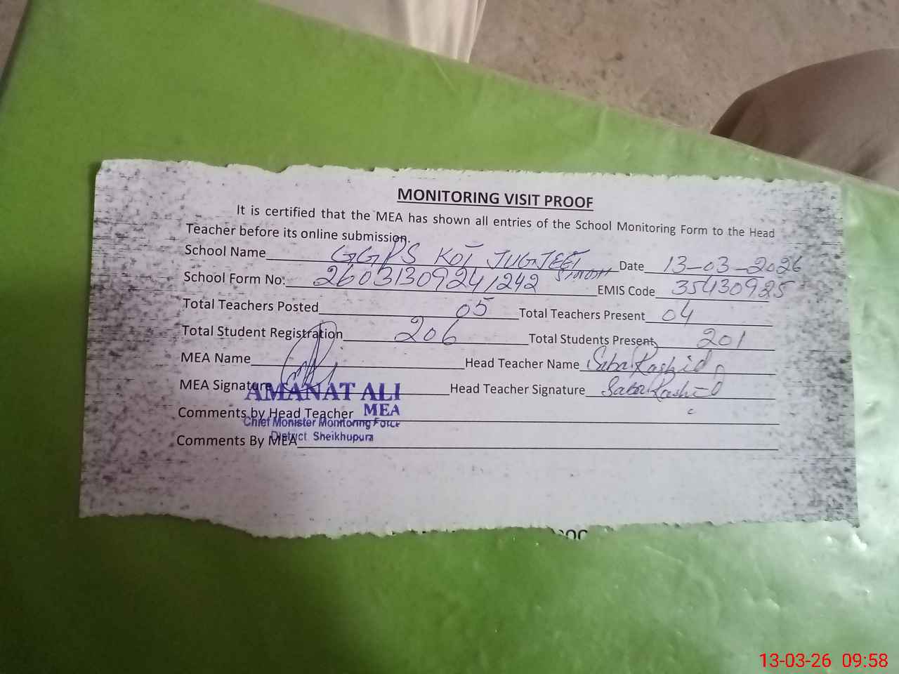 | Attendance Register | Head Teacher | MEA with School | Visit Proof |