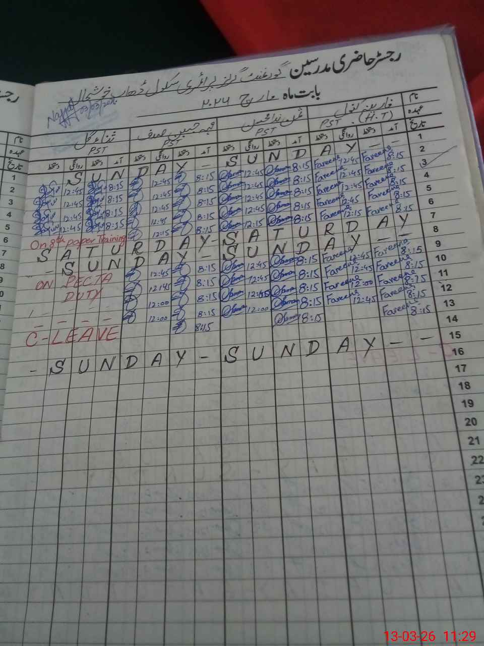 | Leave | Duty | Absent | Maternity | Medical | Ex- Pak |