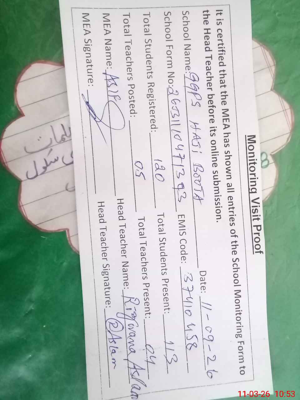 | Attendance Register | Head Teacher | MEA with School | Visit Proof |