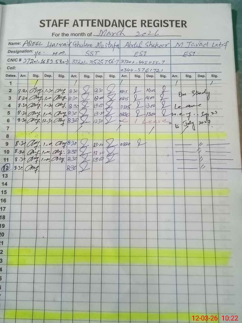 | CNIC | Full Name | Designation | R/C | Absence during last cal. month |