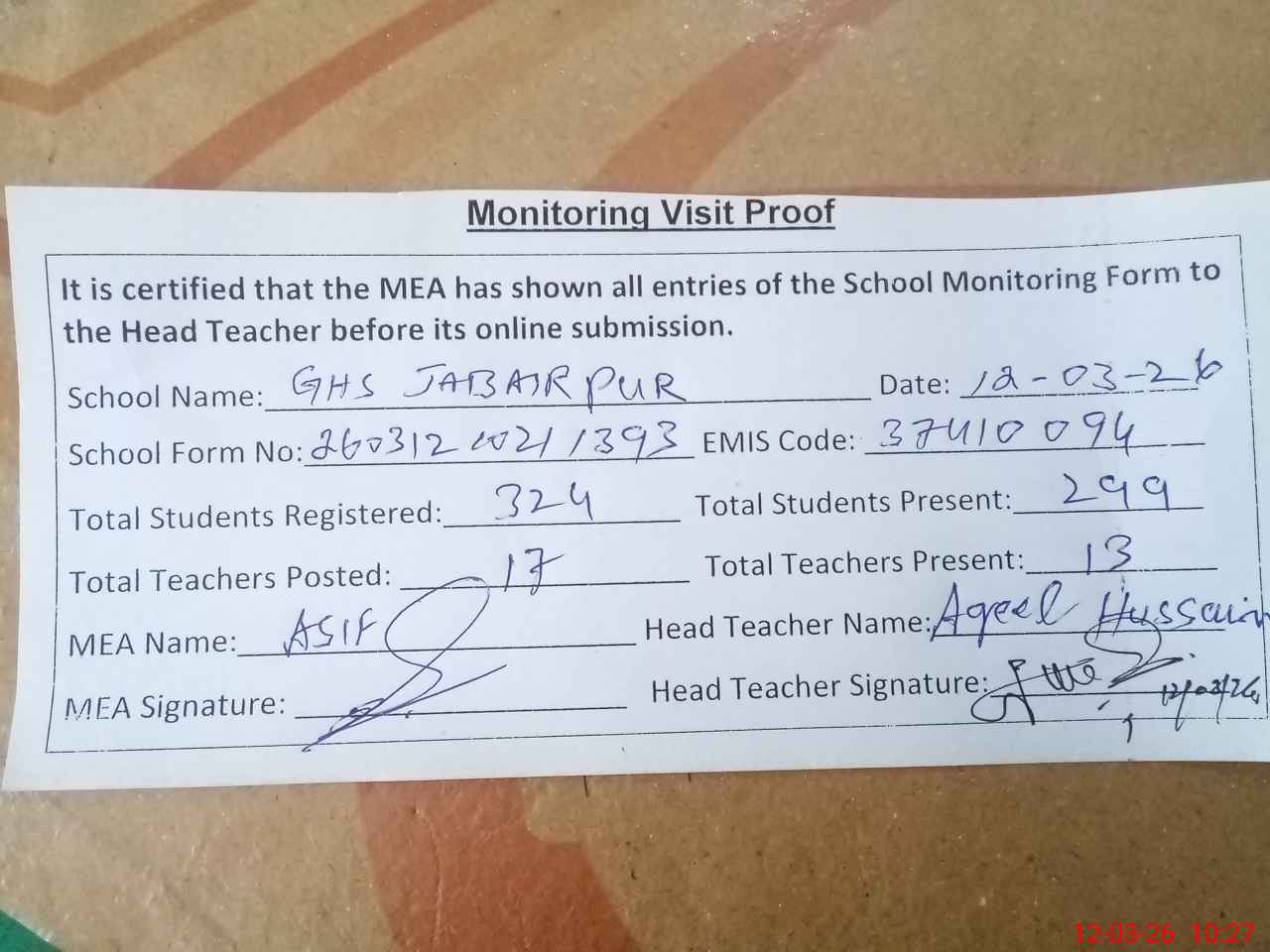 | Attendance Register | Head Teacher | MEA with School | Visit Proof |