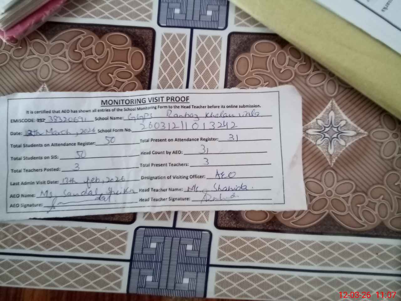 | Attendance Register | Head Teacher | MEA with School | Visit Proof |