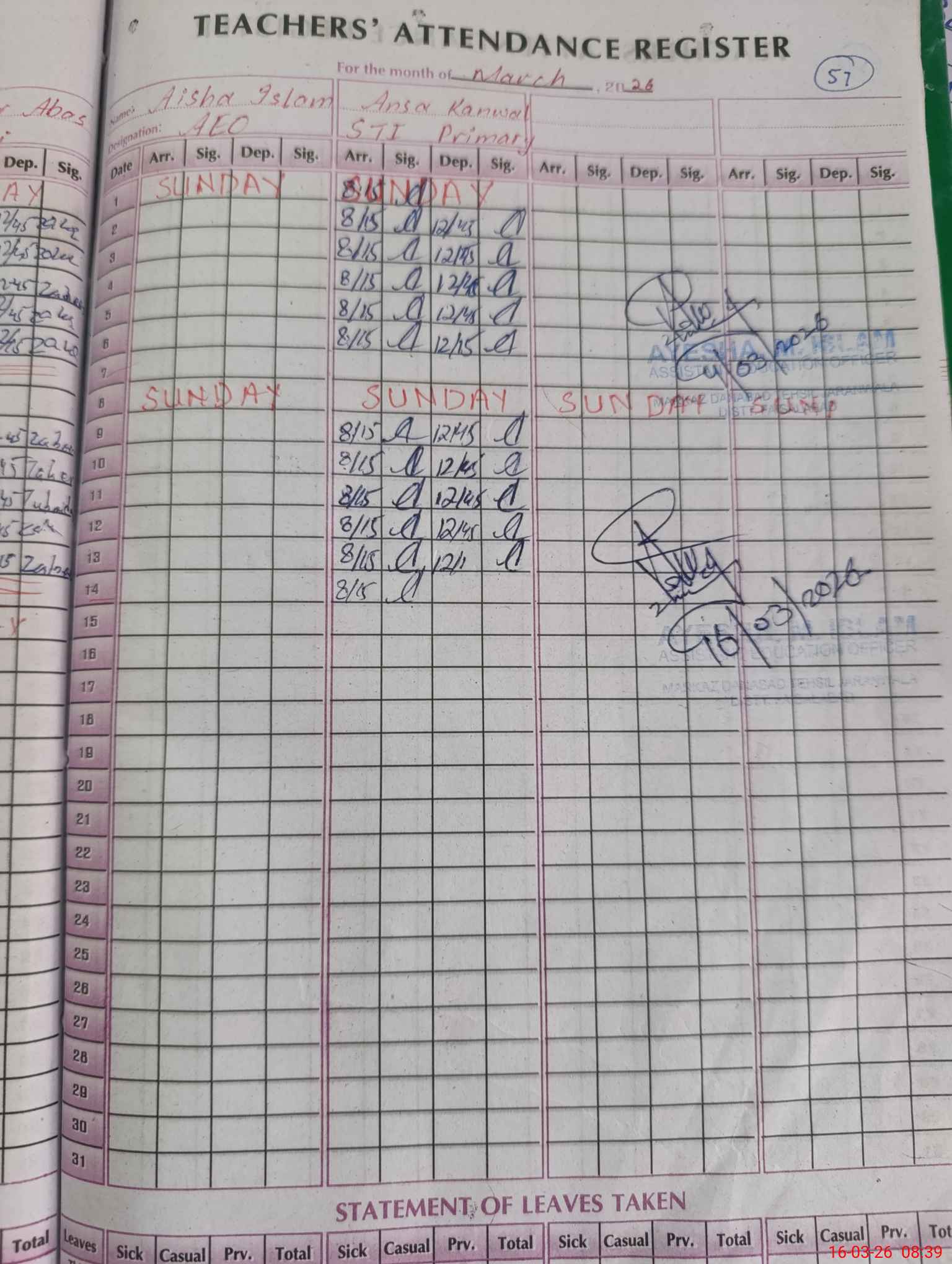 | Monitoring Date: 16-03-2026 | Start Time: 16-03-2026 08:07 AM | End Time: 16-03-2026 08:50 AM | Name of MEA: AY**** MU**** IS**** | |