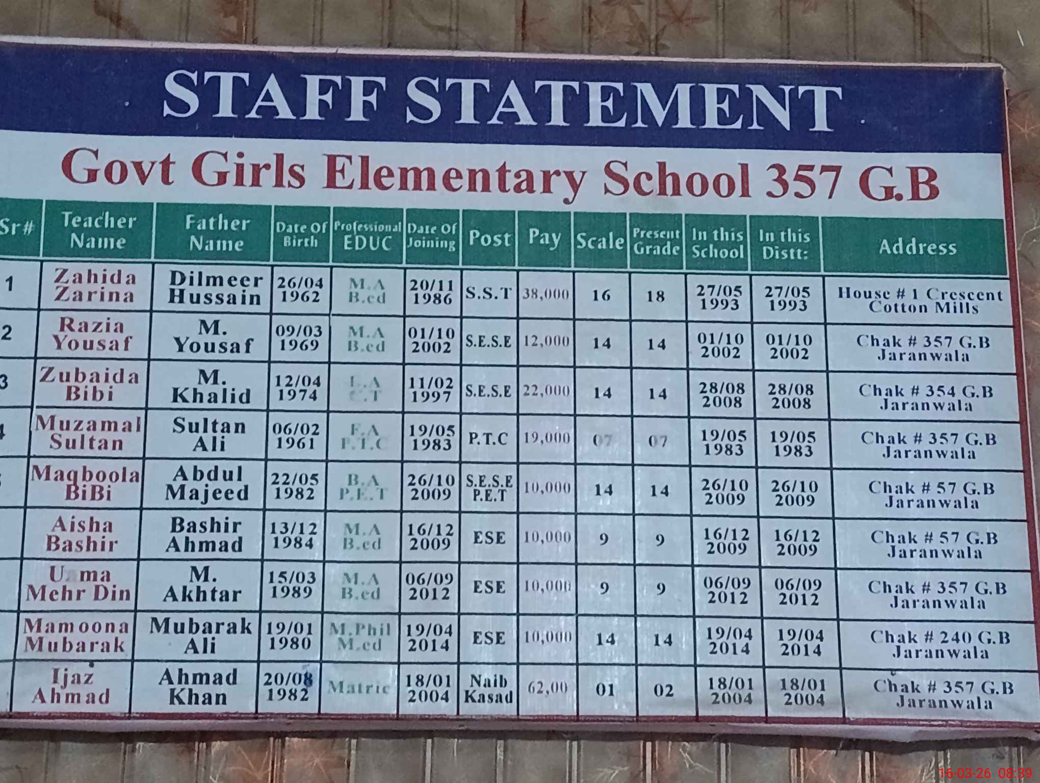 | Name: Zu**** Bi**** Designation: (School Headmaster's/Headmistress's) EST (GEN) Phone/Cell Number: 03**** |