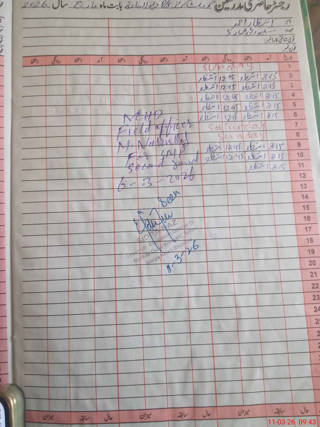 | CNIC | Full Name | Designation | R/C | Absence During Last Calender Month |