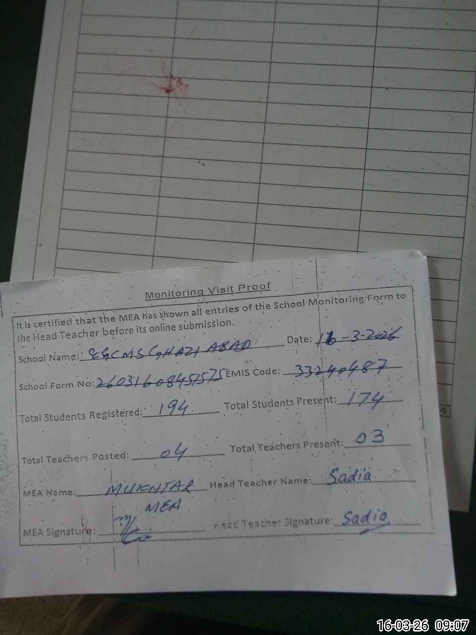 | Attendance Register | Head Teacher | MEA with School | Visit Proof |