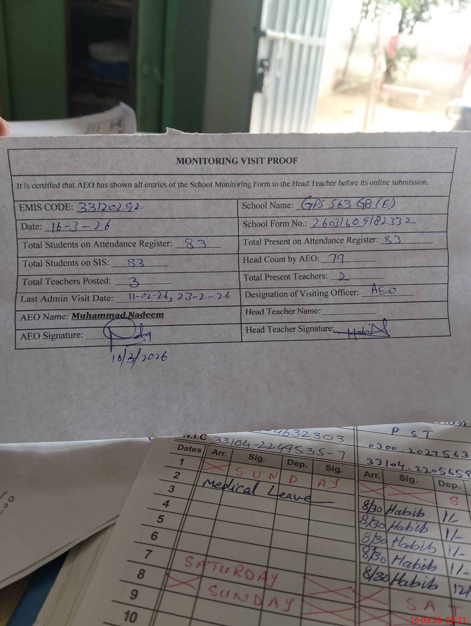 | Attendance Register | Head Teacher | MEA with School | Visit Proof |