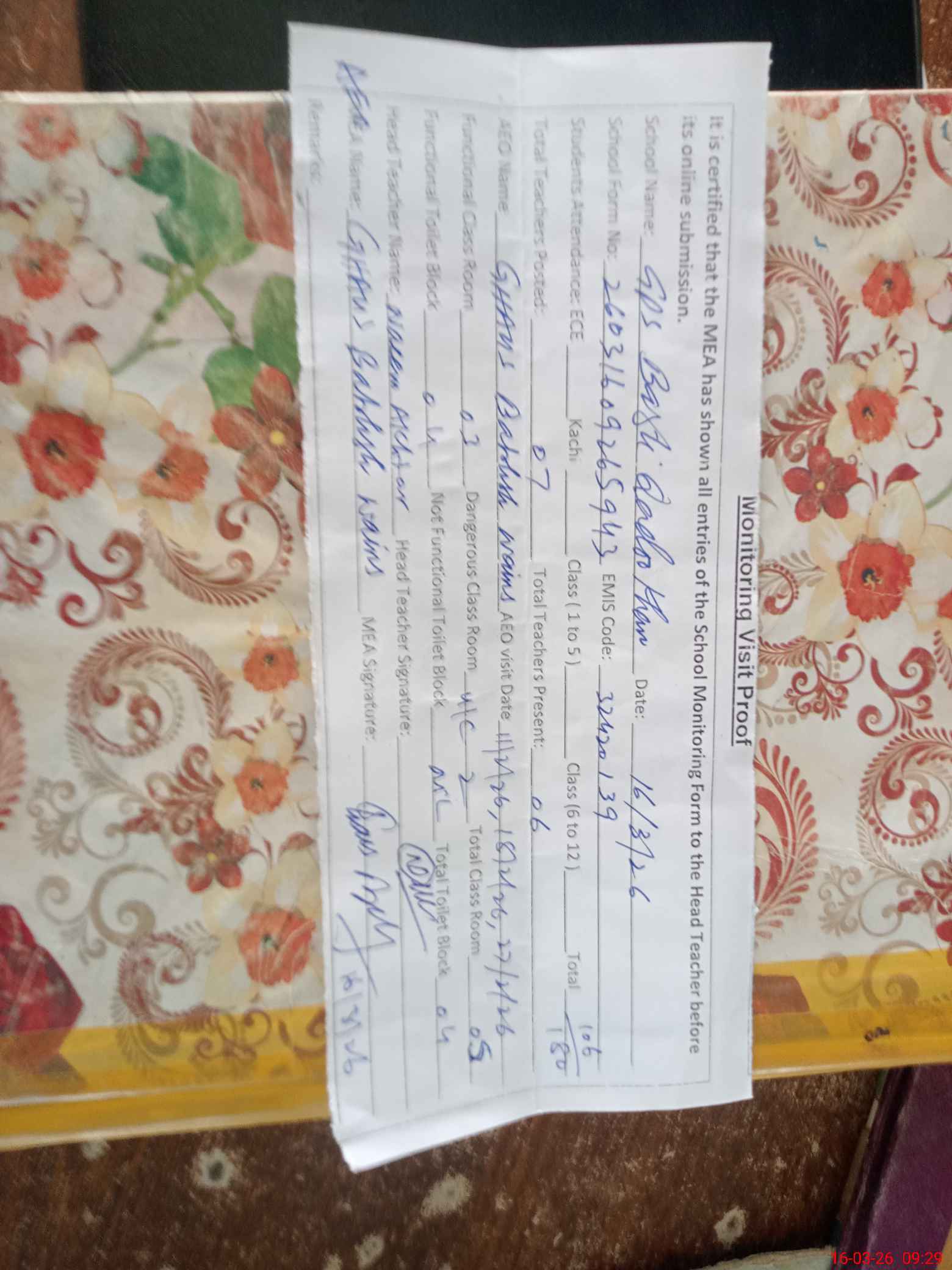 | Attendance Register | Head Teacher | MEA with School | Visit Proof |