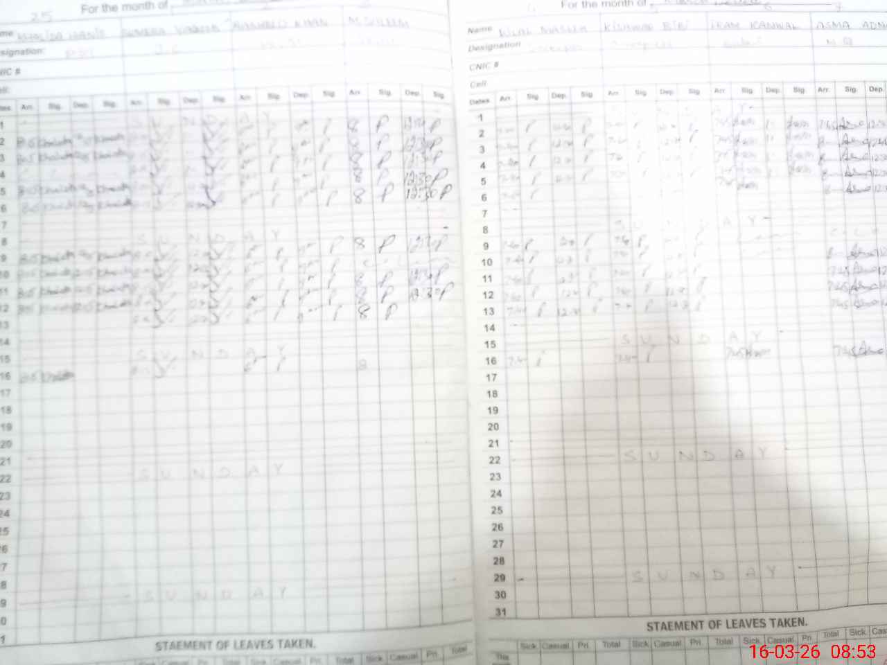 | CNIC | Full Name | Designation | R/C | Absence During Last Calender Month |