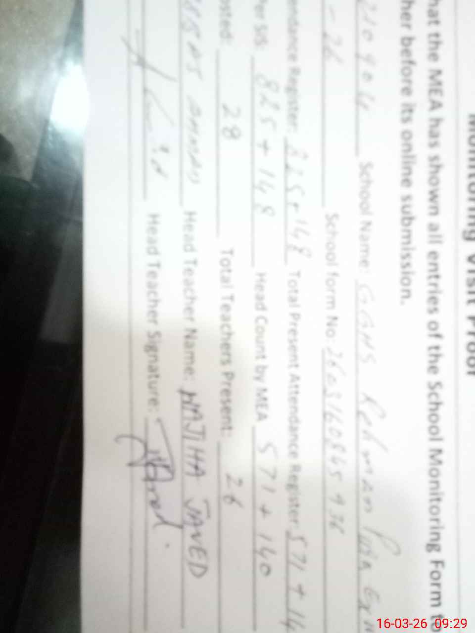 | Attendance Register | Head Teacher | MEA with School | Visit Proof |