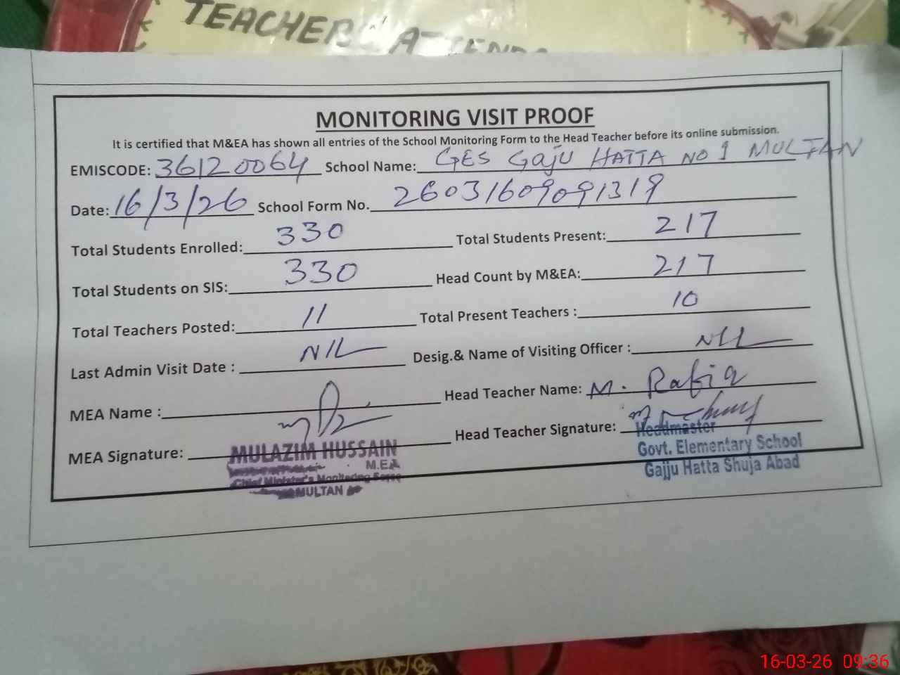 | Attendance Register | Head Teacher | MEA with School | Visit Proof |