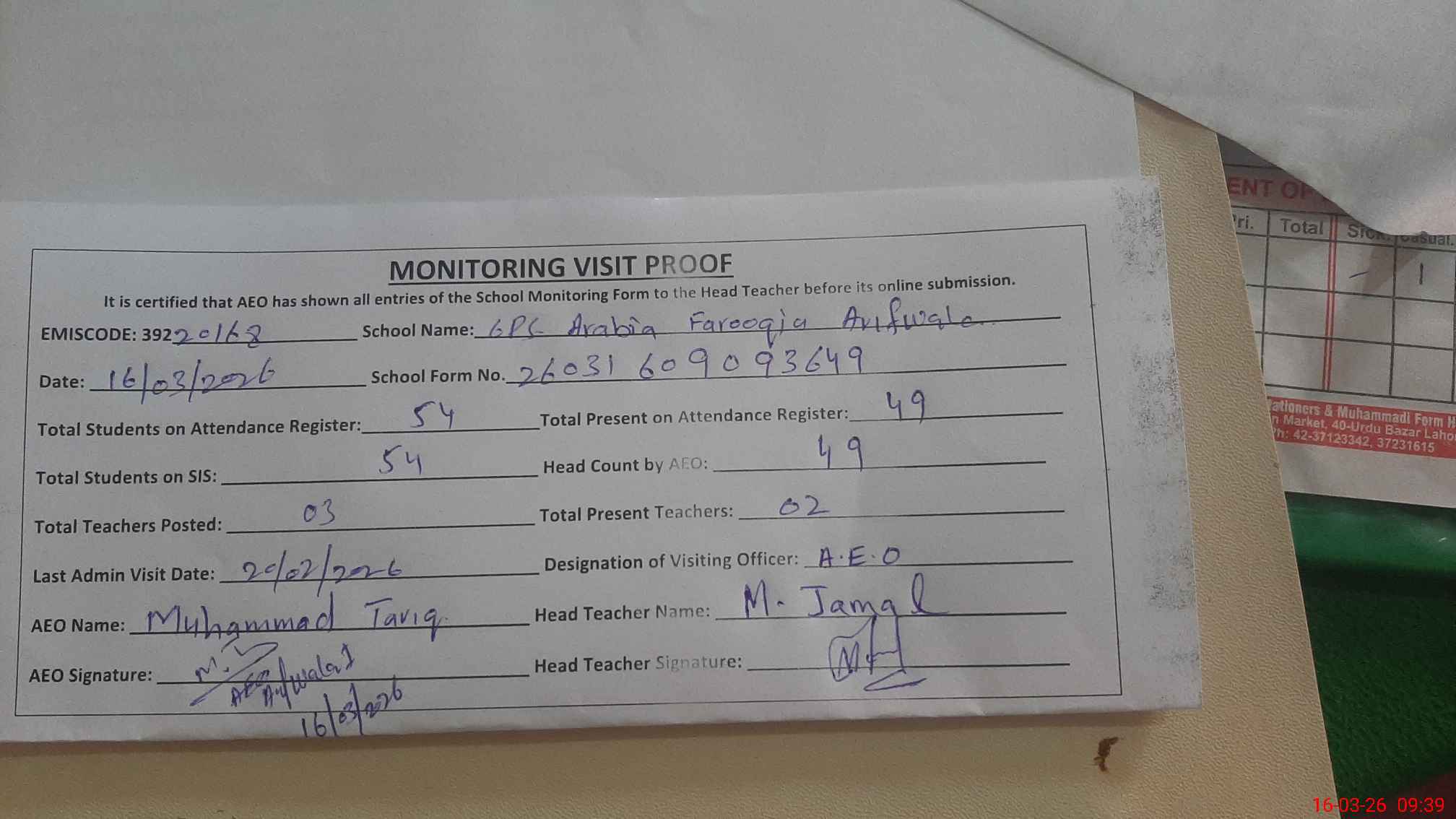 | EMIS Code: 39220168 | Name of School: GPS ARABIA FAROOQIA ARIFWALA J BLOCK | |||
