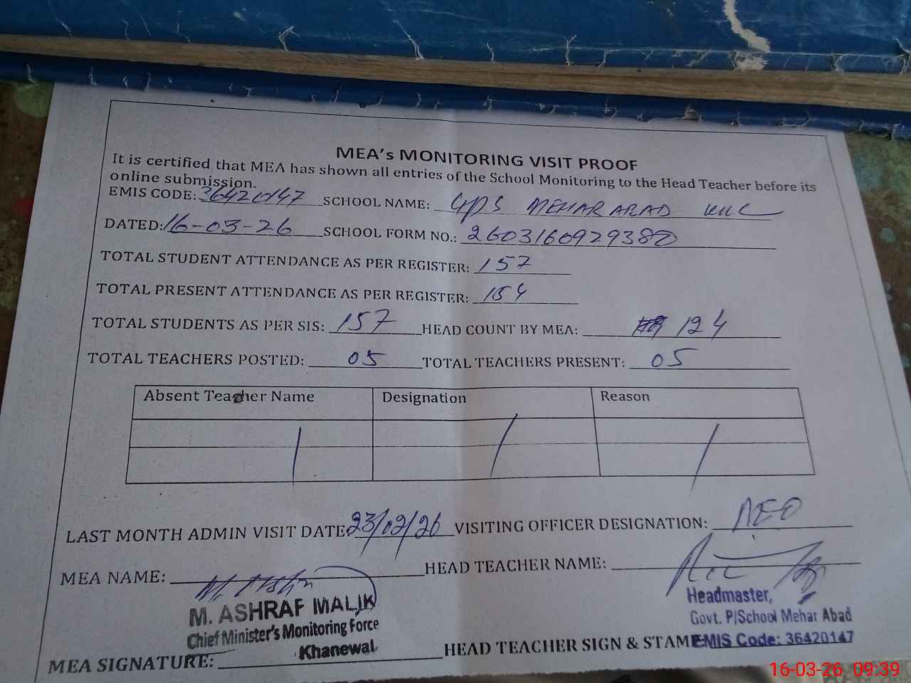 | EMIS Code: 36420147 | Name of School: GPS MEHAR ABAD, KHANEWAL | |||