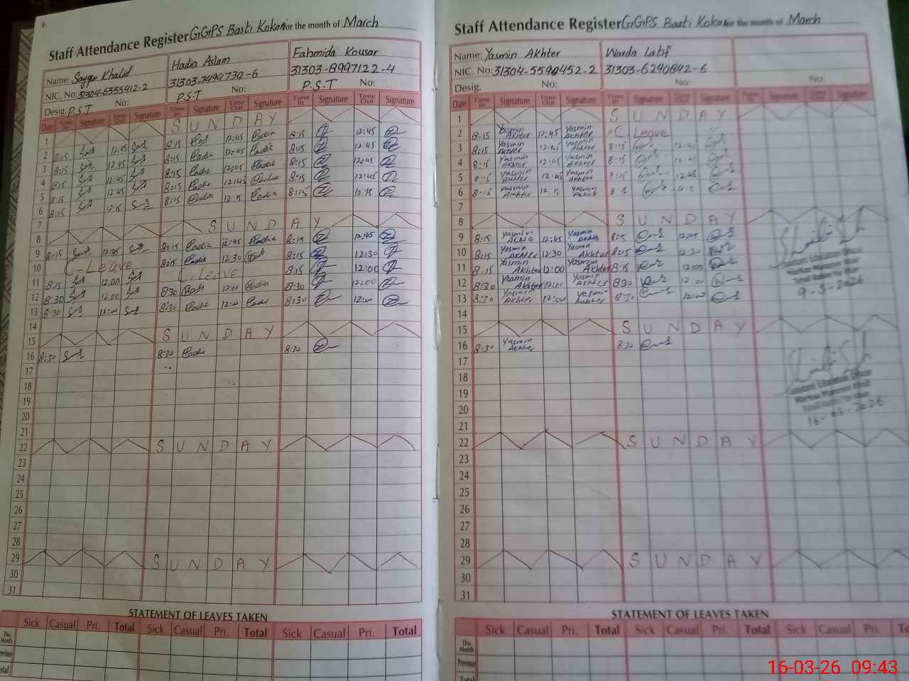 | CNIC | Full Name | Designation | R/C | Absence During Last Calender Month |
