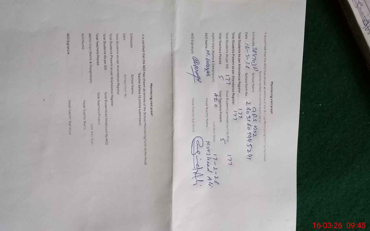 | Attendance Register | Head Teacher | MEA with School | Visit Proof |