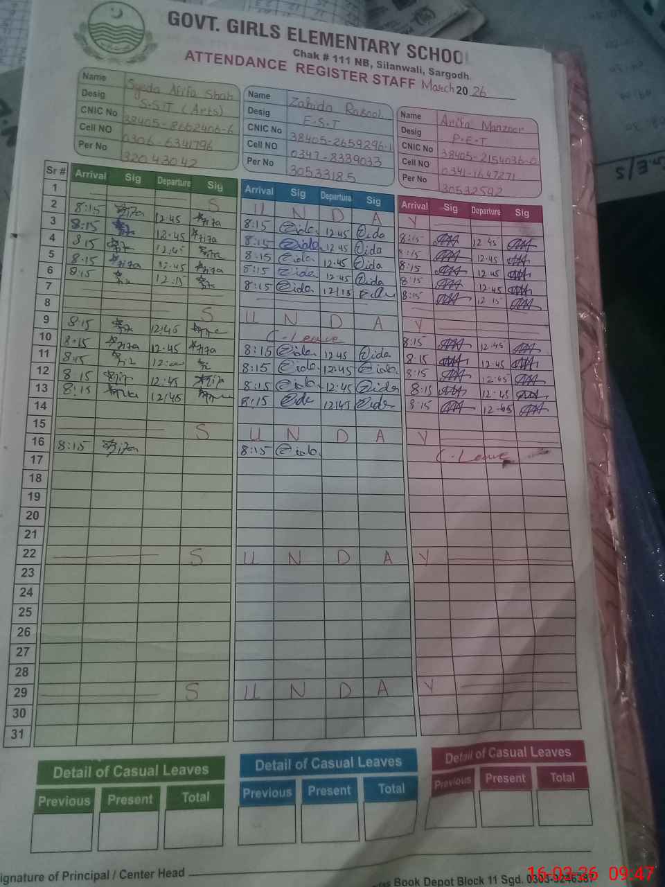| CNIC | Full Name | Designation | R/C | Absence During Last Calender Month |
