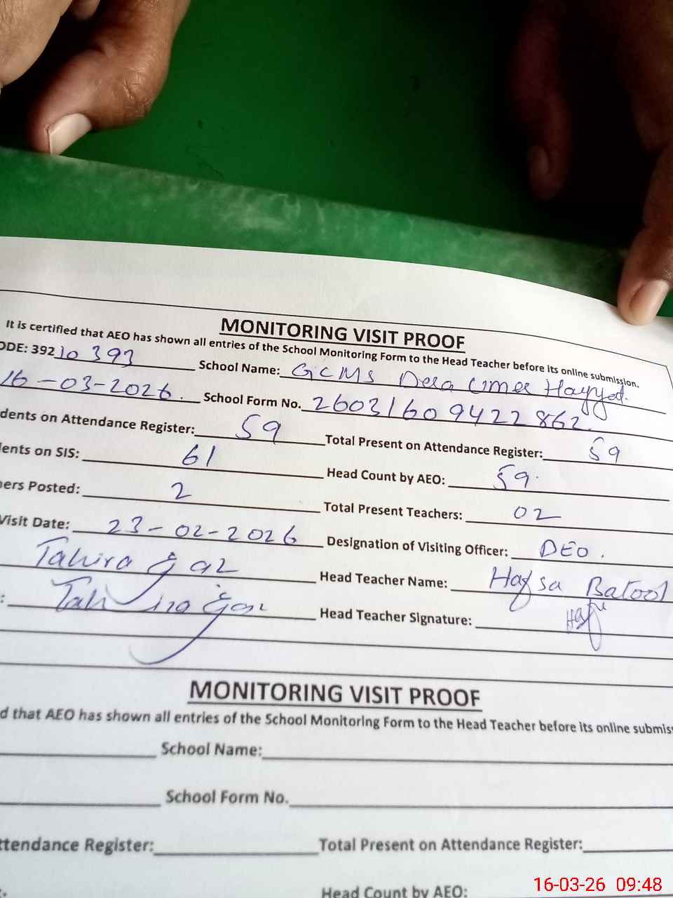 | Attendance Register | Head Teacher | MEA with School | Visit Proof |