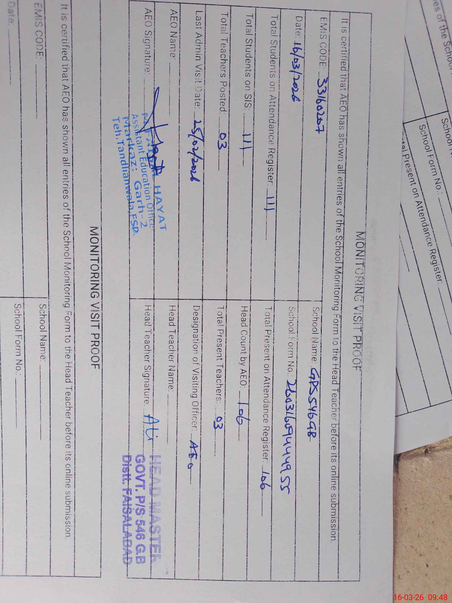 | EMIS Code: 33160207 | Name of School: GPS CHAK 546 GB MAMUNKANJAN TANDLIANWALA | |||