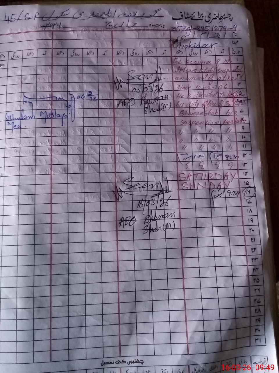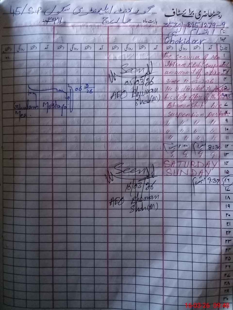 | 35**** | Ib**** Il**** | CHOWKIDAR | Regular | 0 | 0 | 2 | 0 | 0 | 0 | 0 | 0 | 0 | Absent (Un-Authorized) |