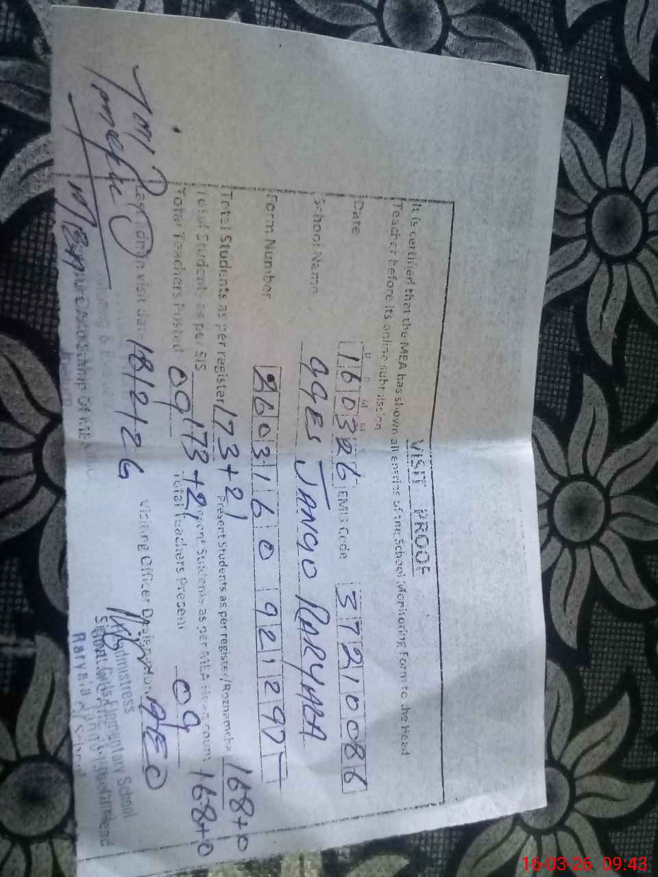 | Certified that this School was Inspected by the Undersigned MEA/DMO Today and the Information Stated Above is as Per Record. | |||||
