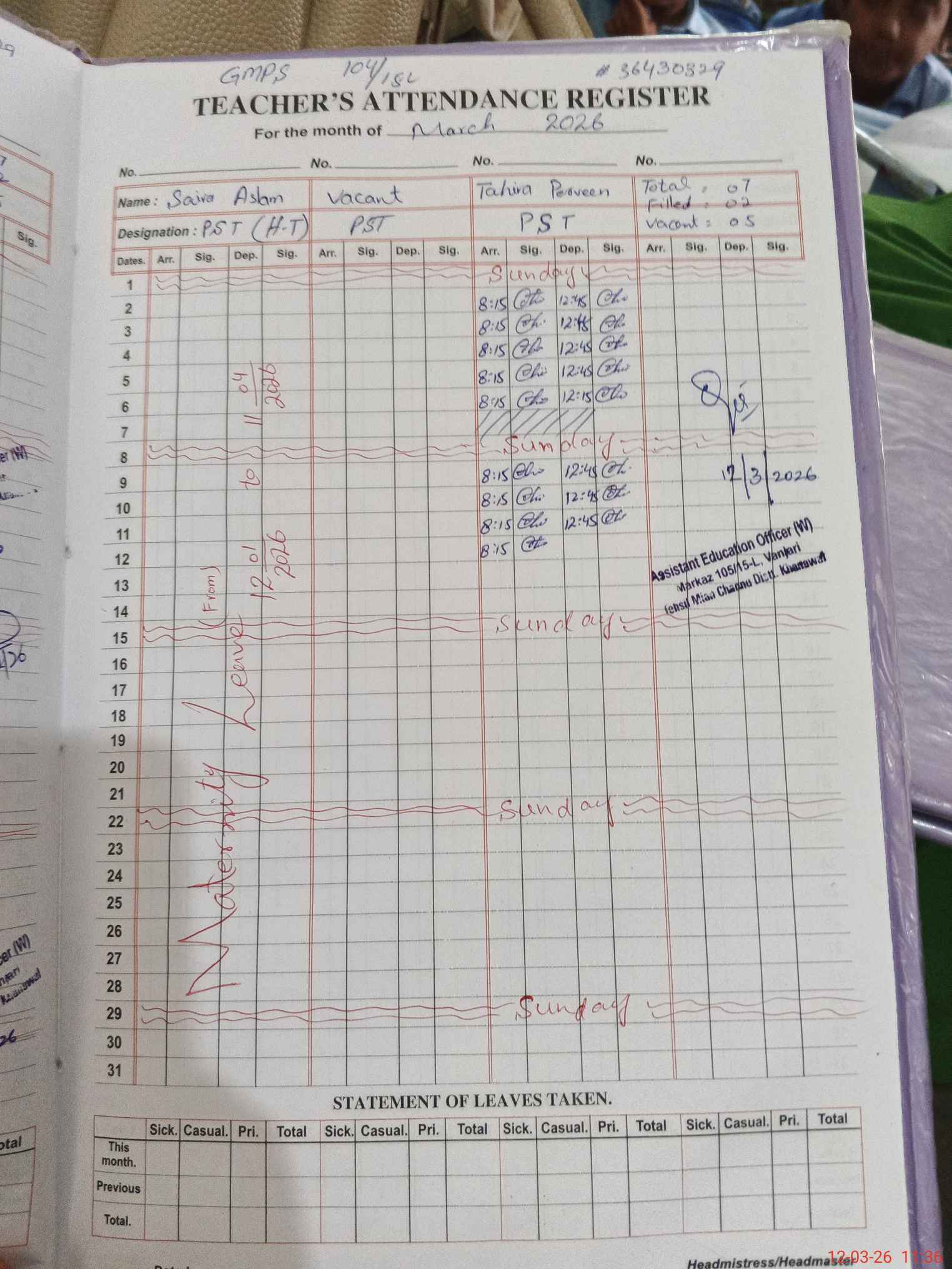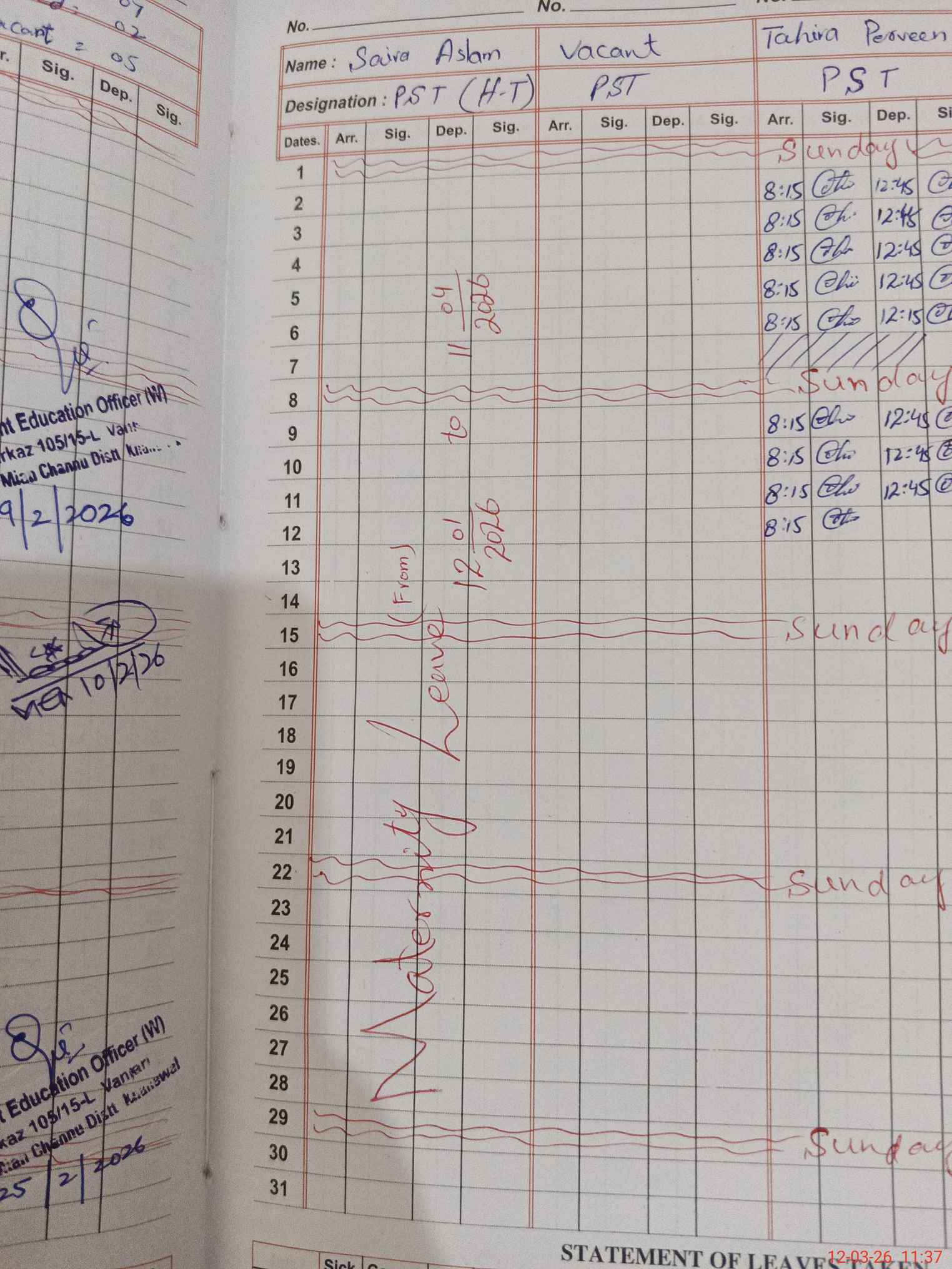 | 36**** | Sa**** As**** | PST Arts | Regular | 0 | 0 | 0 | 0 | 0 | 0 | 0 | 0 | 0 | Maternity |