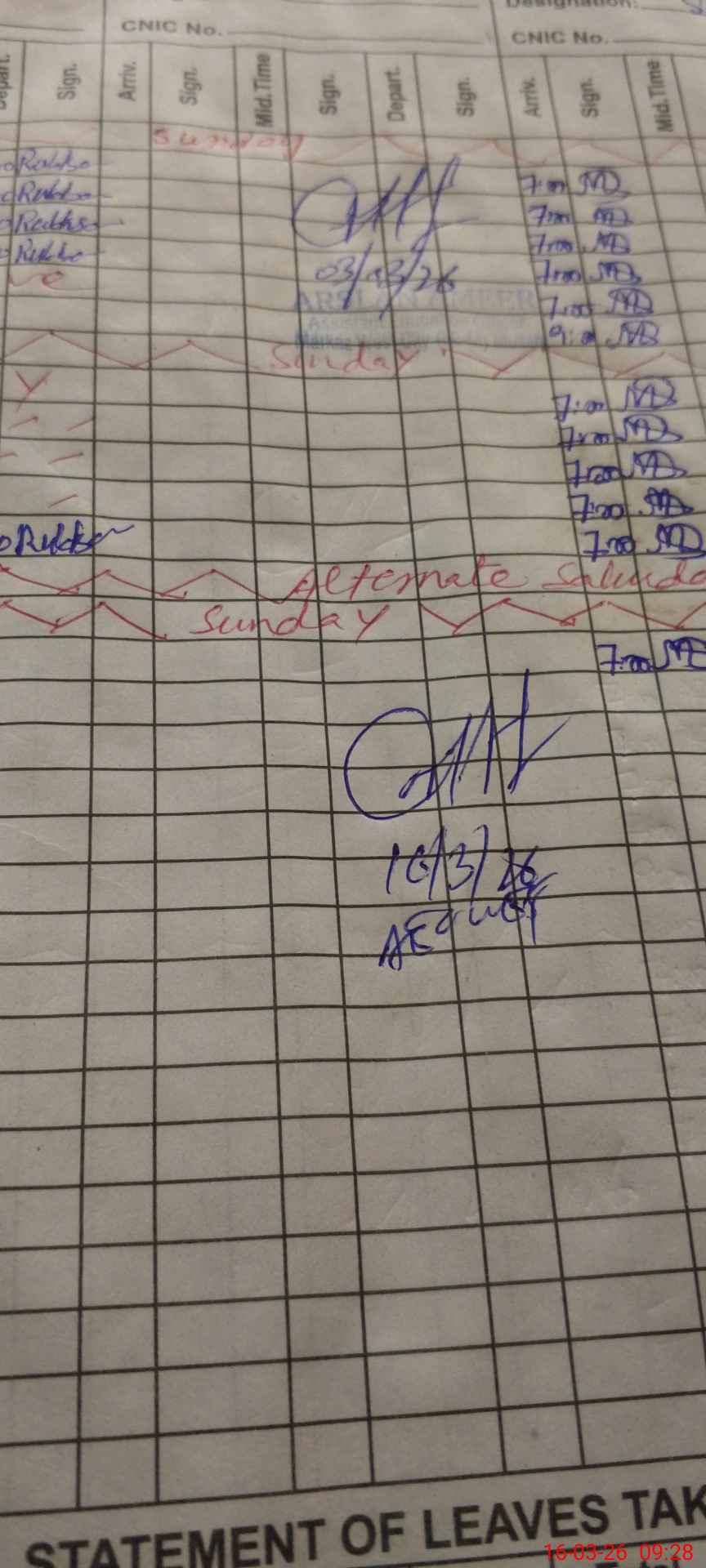 | CNIC | Full Name | Designation | R/C | Absence during last cal. month |