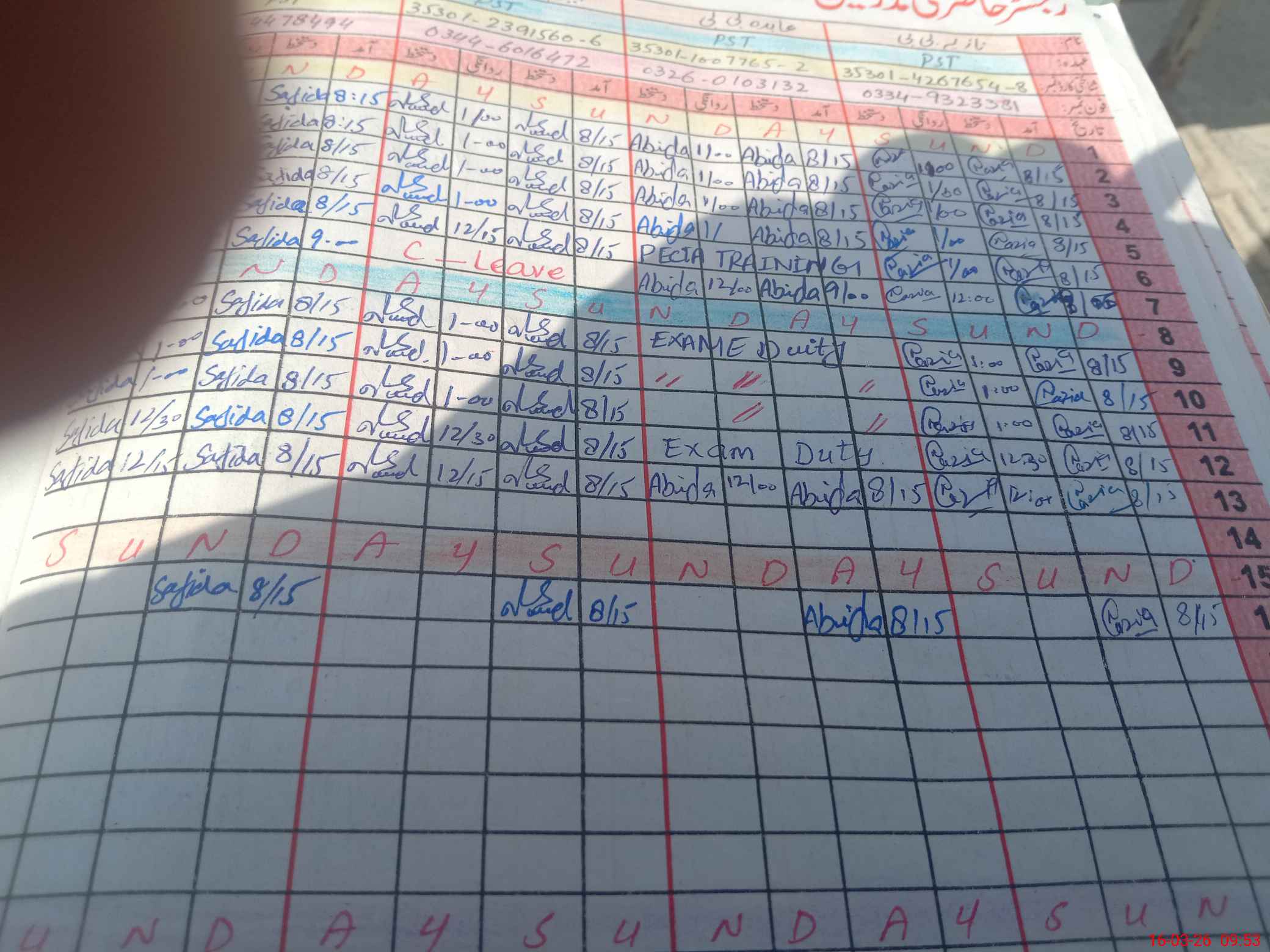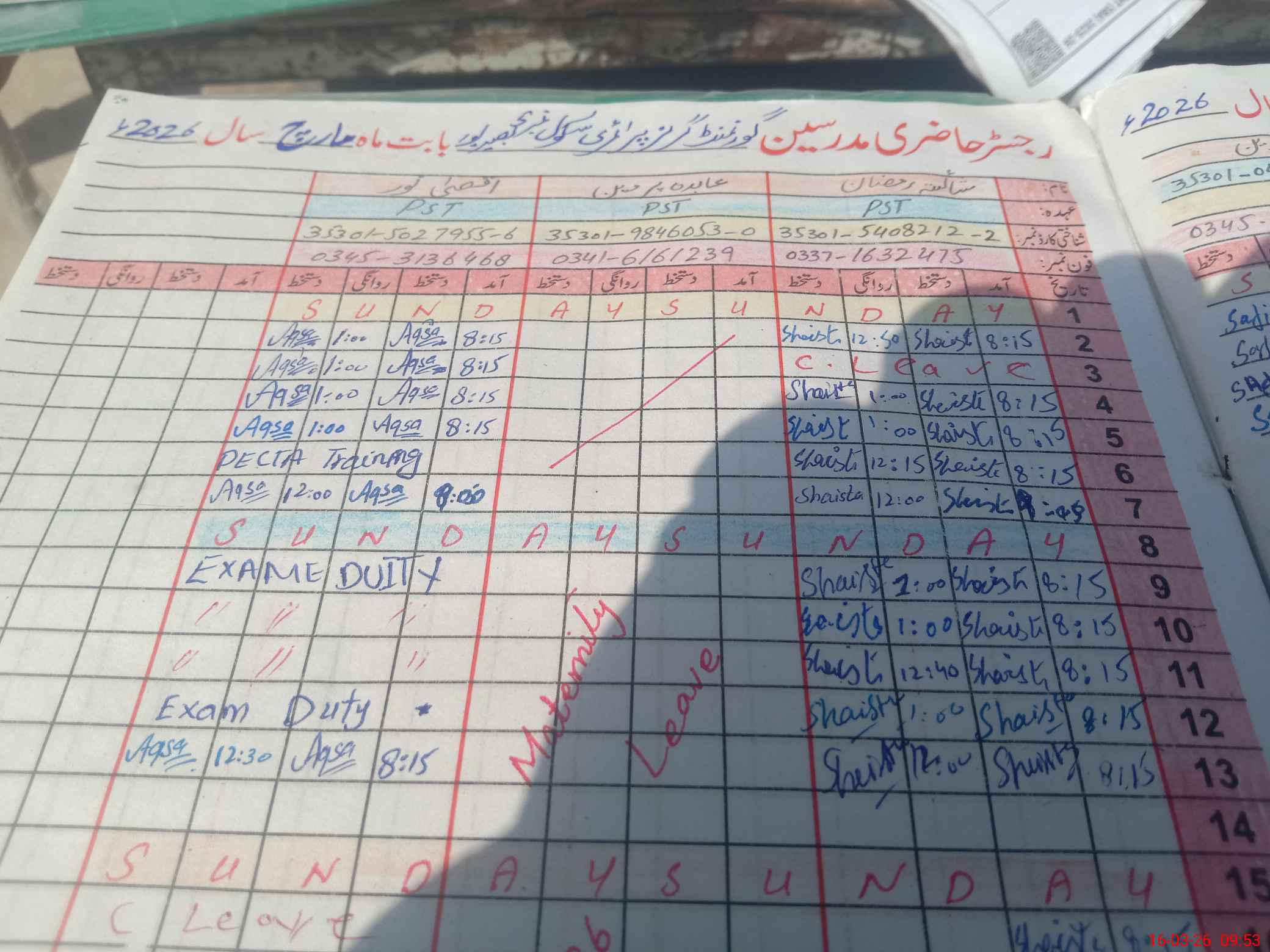 | Leave | Duty | Absent | Maternity | Medical | Ex- Pak |