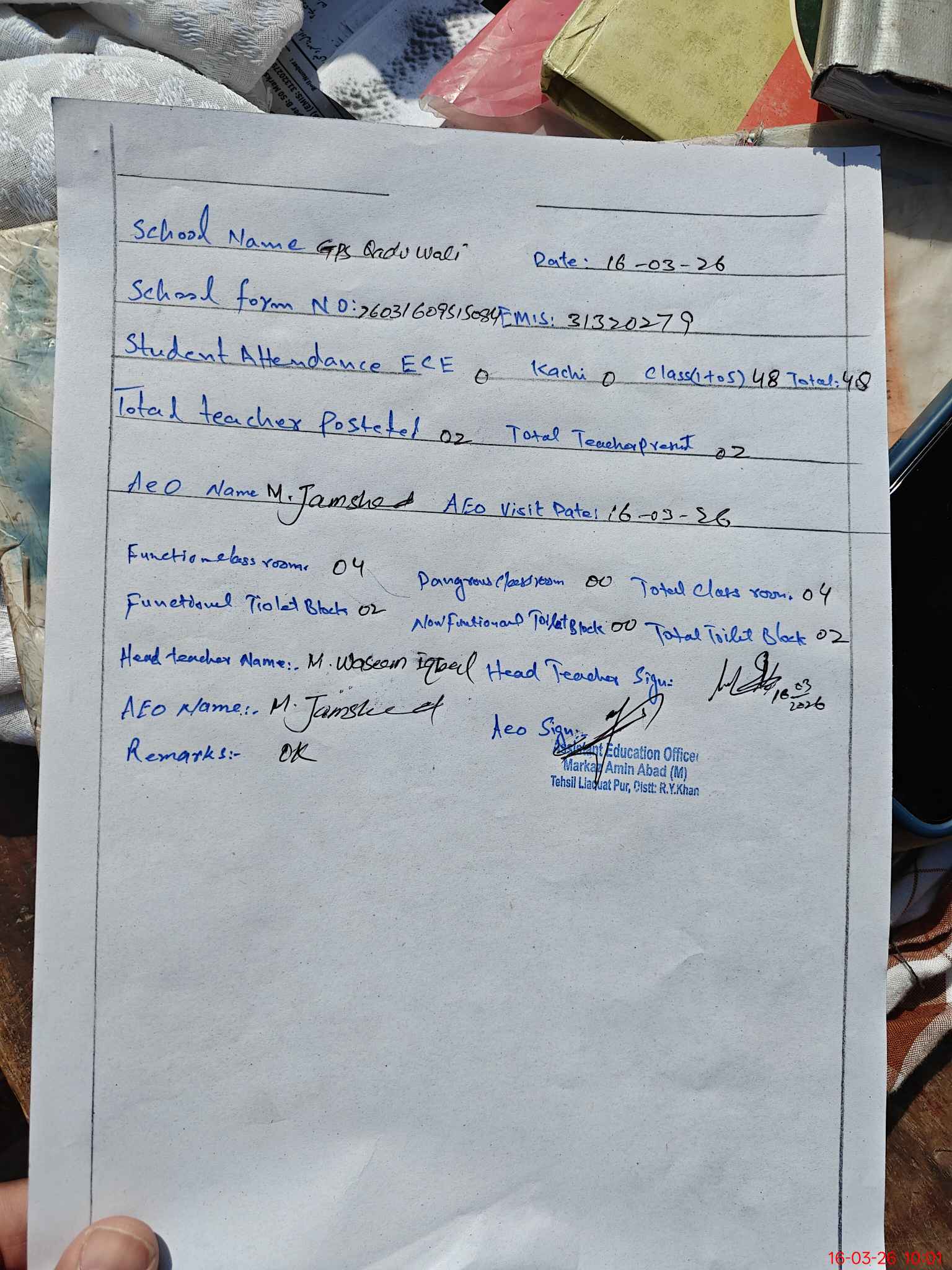 | District: RAHIMYAR KHAN | Tehsil: LIAQATPUR | Markaz: AMIN ABAD - MALE | Level: Primary | |