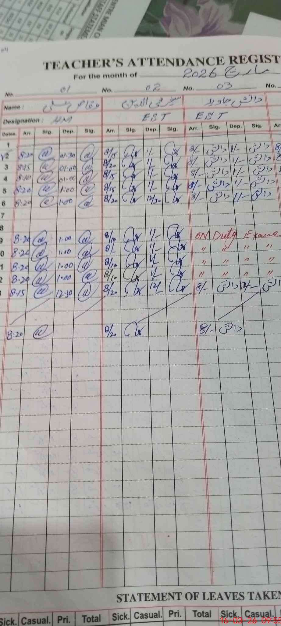 | Leave | Duty | Absent | Maternity | Medical | Ex- Pak |